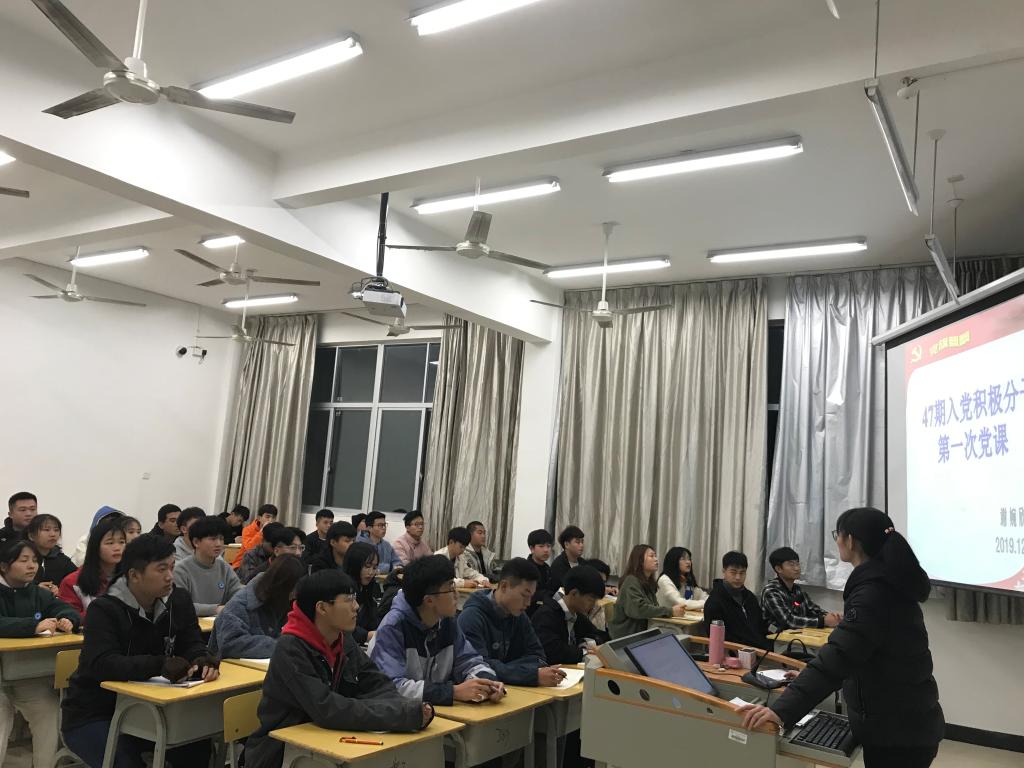 为深入引导各位积极分子坚定理想信念,端正入党动机,2019年12月8日19:00,在实训四309教室,自动化工程系学生第一党支部副书记谢婉欣老师为第47期共48位入党积极分子上党课。