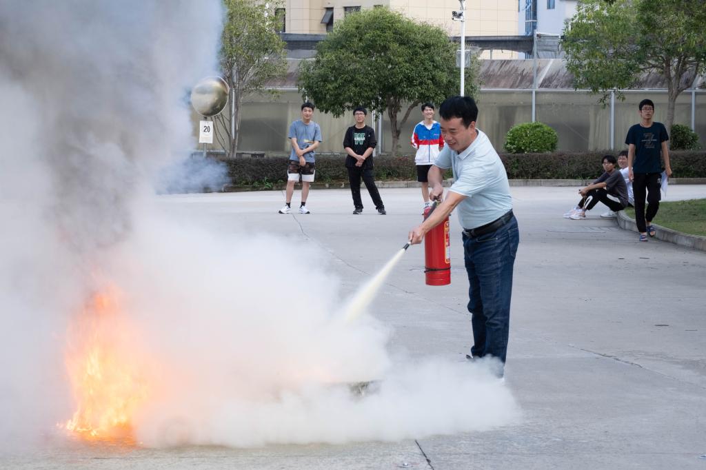 最后,院安保处处长胡宗焕老师详细讲解了灭火器的使用方法和注意事项,现场演示灭火器使用步骤并进行模拟火灾初期灭火。随即,各班保委委员、宿舍长以及在场的各位同学们在胡宗焕老师的指导下进行亲身实践,学行合一,使同学们真正掌握灭火器使用方法。至此,消防疏散演练圆满结束。