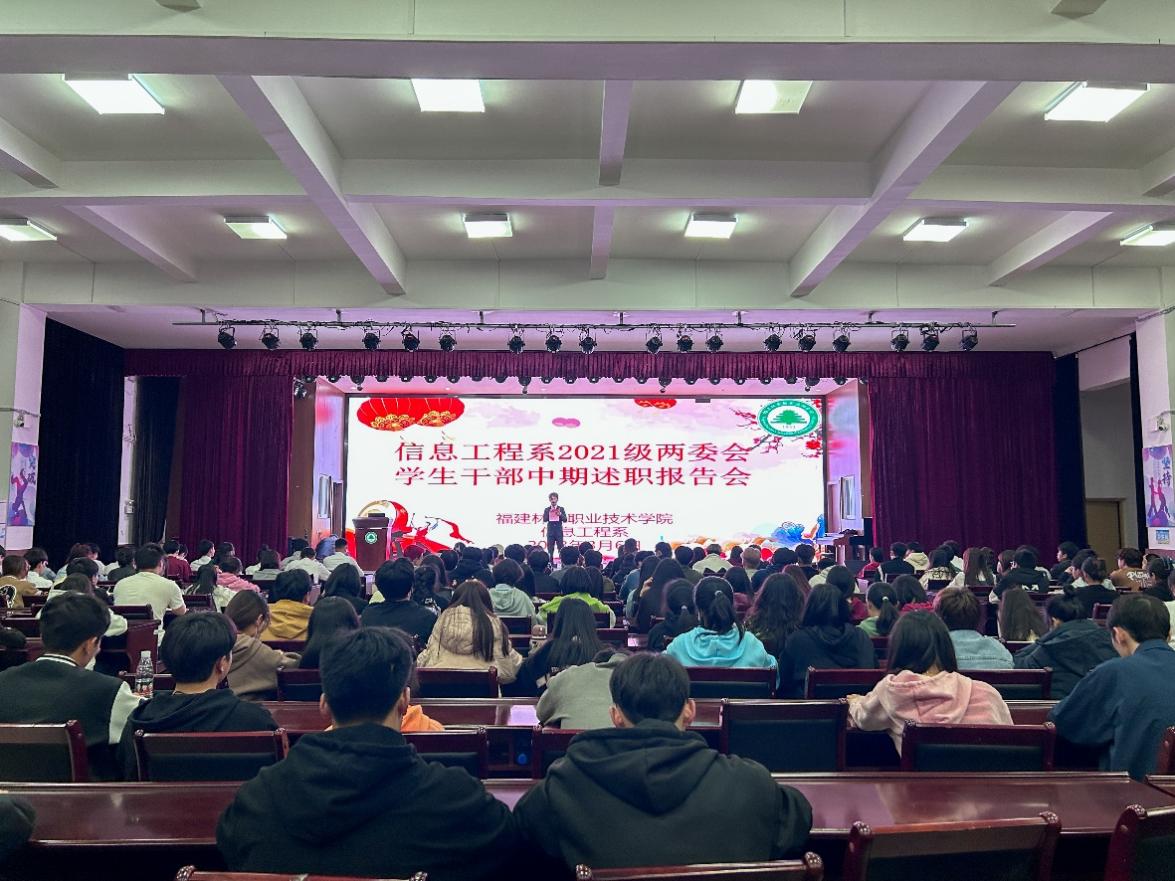 为进一步加强信息工程系两委会学生干部建设,提高两委会各部门工作的实效性、积极性,促进两委会组织工作制度化、规范化、系统化,发挥好两委会联系广大同学的桥梁和纽带作用,以崭新面貌迎接我校建校七十周年,信息工程系于3月6日晚7点在江南礼堂开展信息工程系2021级两委会学生干部中期述职报告会,信息工程系党总支书记、主任华建祥老师、党总支副书记叶文美老师、组织专员谢婉欣老师、学生科科长兼团总支书记吴文杰老师、教务科科长蔡尊煌老师、学生第一党支部书记郑燕丽老师、学生第二党支部书记陈雅佳老师及辅导员参加此次会议,本次会议由信息工程系两委会副主席张锦鹏主持。