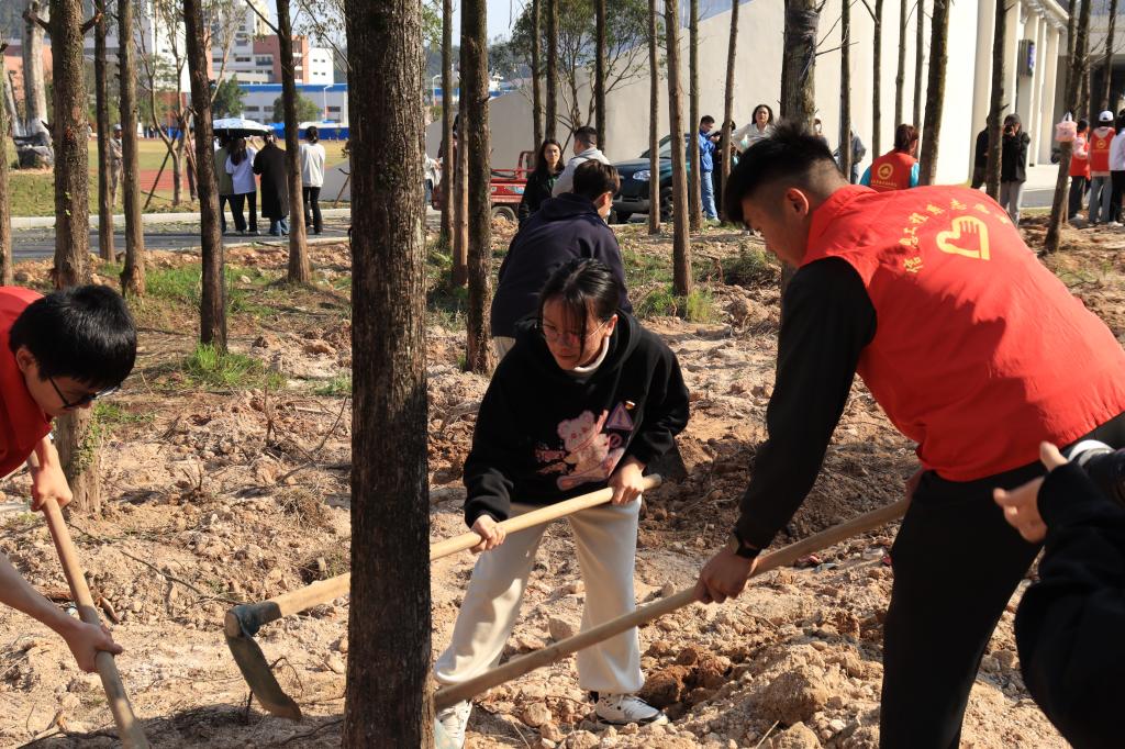 在信工楼旁水杉林,师生志愿者们齐心协力,挥锹挖坑、回填熟土、夯实土层、培土浇水,分工井然有序,干劲十足。忙碌过后,一株株苗木错落有致、迎风挺立,校道呈现一片绿意盎然的景象,充分展现了系部师生“奉献、友爱、互助、进步”的志愿服务精神。