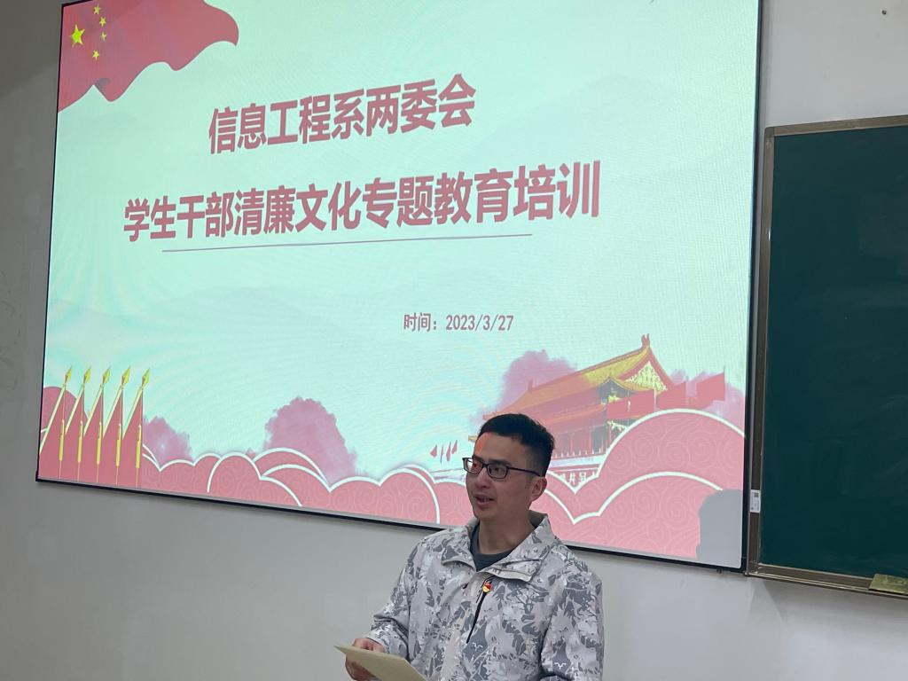 为深入学习宣传贯彻党的二十大精神,营造系部风清气正的良好氛围,培养学生干部清正廉洁的价值观,鼓励优秀共青团员积极向党组织靠拢,为党组织输送新鲜血液,2023年3月27日,信息工程系于实训四208组织召开两委会学生干部清廉文化专题教育培训暨推优入党大会,本次会议由信息工程系团总支书记吴文杰主持,两委会学生干部参加会议。
