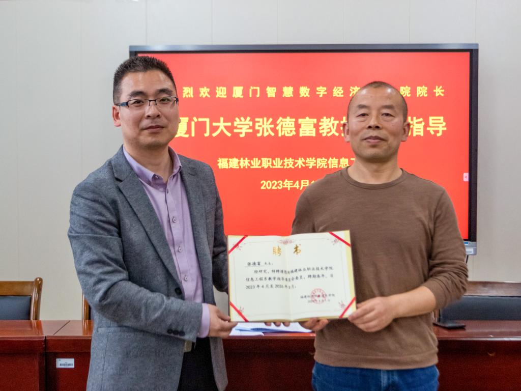 座谈会后,信息工程系党总支书记、主任华建祥为张德富教授颁发了大数据技术专业群教学指导委员会委员聘书并合影留念。