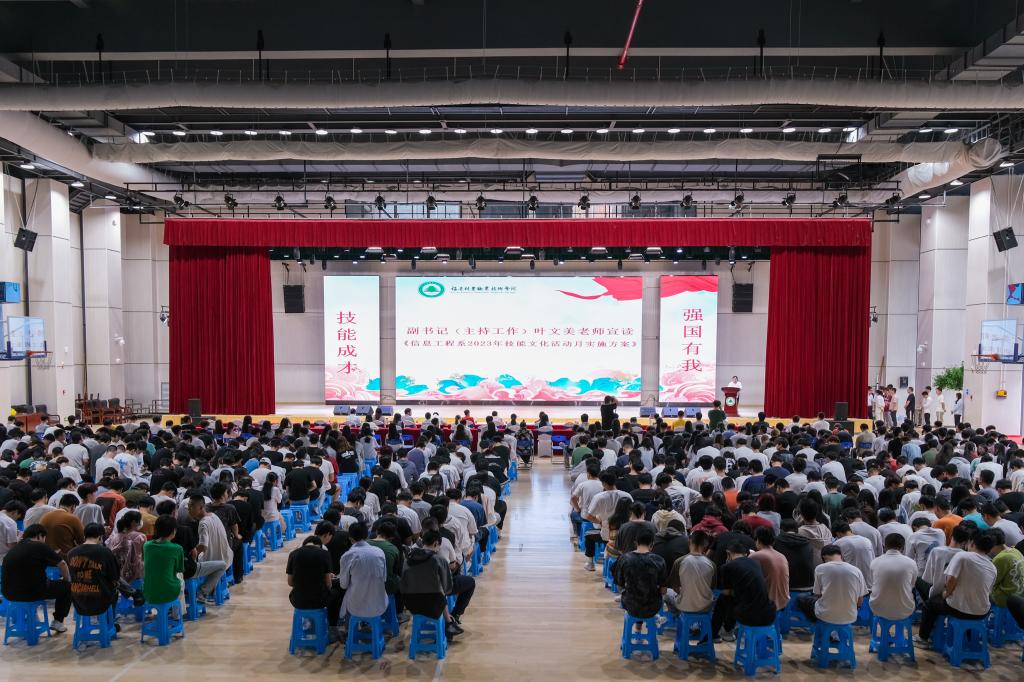 为了深入学习贯彻党的二十大精神,落实立德树人根本任务,进一步打造以“工匠精神”为核心的校园技能文化品牌,彰显职业教育魅力,展示学生扎实娴熟专业技能及良好的素质,夯实技能基础,提升专业素养,锻造工匠品质。根据《福建林业职业技术学院关于印发2023年度“技能文化活动月”实施方案的通知》,2023年5月23日下午,信息工程系2023年技能文化活动月开幕式在江南体育馆隆重举行。副院长谢金生、院学生部部长蔡敏、院团委副书记雷栩艺、系主任华建祥、党总支副书记(主持工作)叶文美、专职组织员谢婉欣、学生科科长兼团总支书记吴文杰、教学科科长蔡尊煌、学工组全体专职辅导员、各赛项指导教师以及系参赛参会学生共计700余人参加开幕式。开幕式由系学生科科长兼团总支书记吴文杰主持。