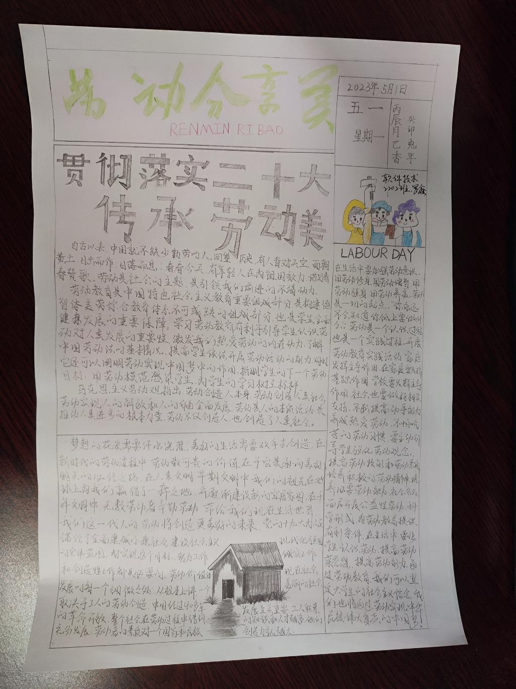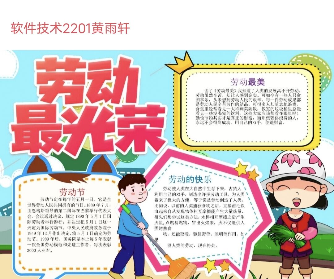 在辅导员的引导下,全体同学专心致志、兴趣浓厚,积极参与心理绘画练习等兼具知识性和趣味性的小活动。同时,班级掀起了学习劳动精神的热潮,同学们纷纷以劳动教育画报的形式展开宣传,让我们一起欣赏学生制作的优秀劳动画报作品吧~