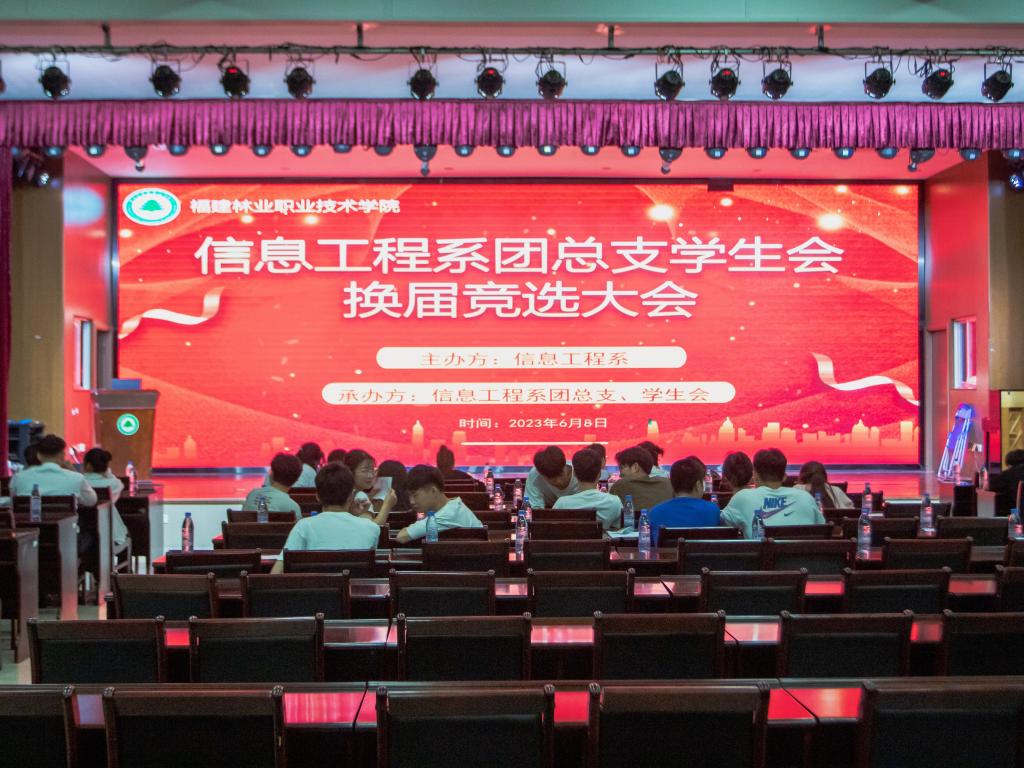 为加强我系学生干部队伍建设,及时为队伍补充新生力量,选拔一批政治坚定、作风过硬、品学兼优、素质全面的学生干部,2023年6月8日晚,福建林业职业技术学院信息工程系2023年团总支学生会换届竞选大会在江南礼堂隆重举行。党总支副书记(主持工作)叶文美、信息工程系团总支书记兼学生科科长吴文杰、专职组织员谢婉欣、各班辅导员以及系团总支学生会全体学生干部和各班级团支部学生代表出席了本次活动。