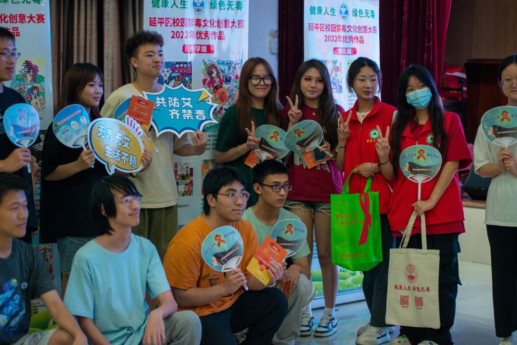 在毒品危害知识普及后,现场进行了有趣的禁毒知识问答环节,并在现场摆设许多禁毒及法制类相关的知识展架及近2年禁毒优秀绘画及手工艺的作品展示供大家学习及欣赏。游戏开始前,工作人员准备了禁毒手举牌,同学们举起手中牌子,共同喊出禁毒口号。