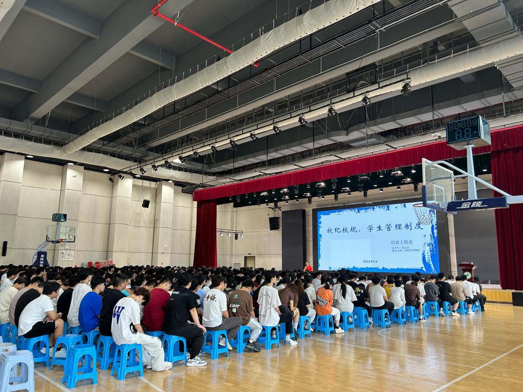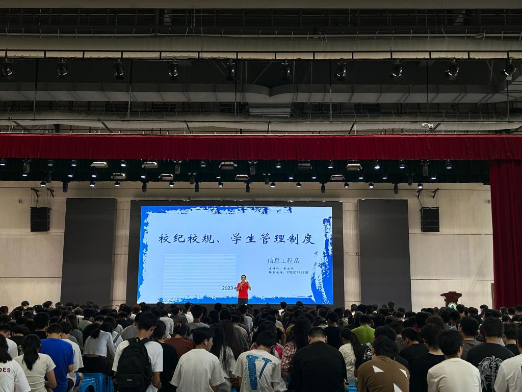 为引导2023级新生尽快熟悉学校校规校纪,养成良好的学习习惯和生活习惯,9月17日下午3点,信息工程系于江南体育馆开展新生入学教育之高等学校学生行为准则、校纪校规和学生管理制度专题讲座,本次讲座由信息工程系学生科科长吴文杰老师主讲,信息工程系2023级全体新生参与听讲。