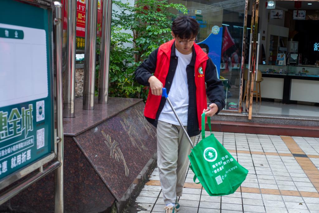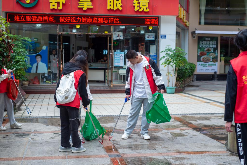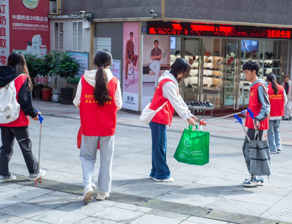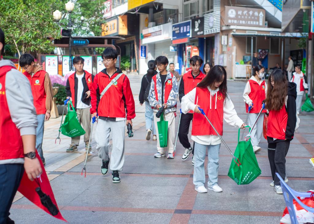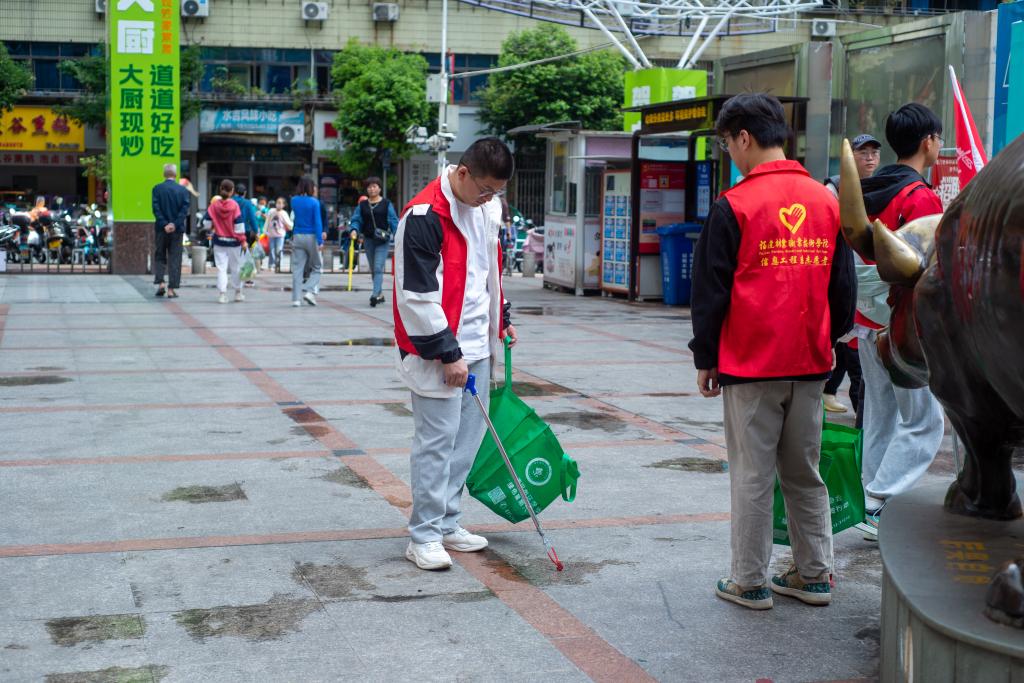 早上八点,志愿者们在步行街集合,穿戴好志愿者服装后,就开始组队分发捡垃圾的工具,一人手拿垃圾钳,一人拿环保袋,开始今天的志愿服务活动。志愿者们干劲十足,团结协作,在步行街展开地毯式搜索,将地面上的烟头,纸巾,塑料袋等等一一捡起来,营造清洁的环境。