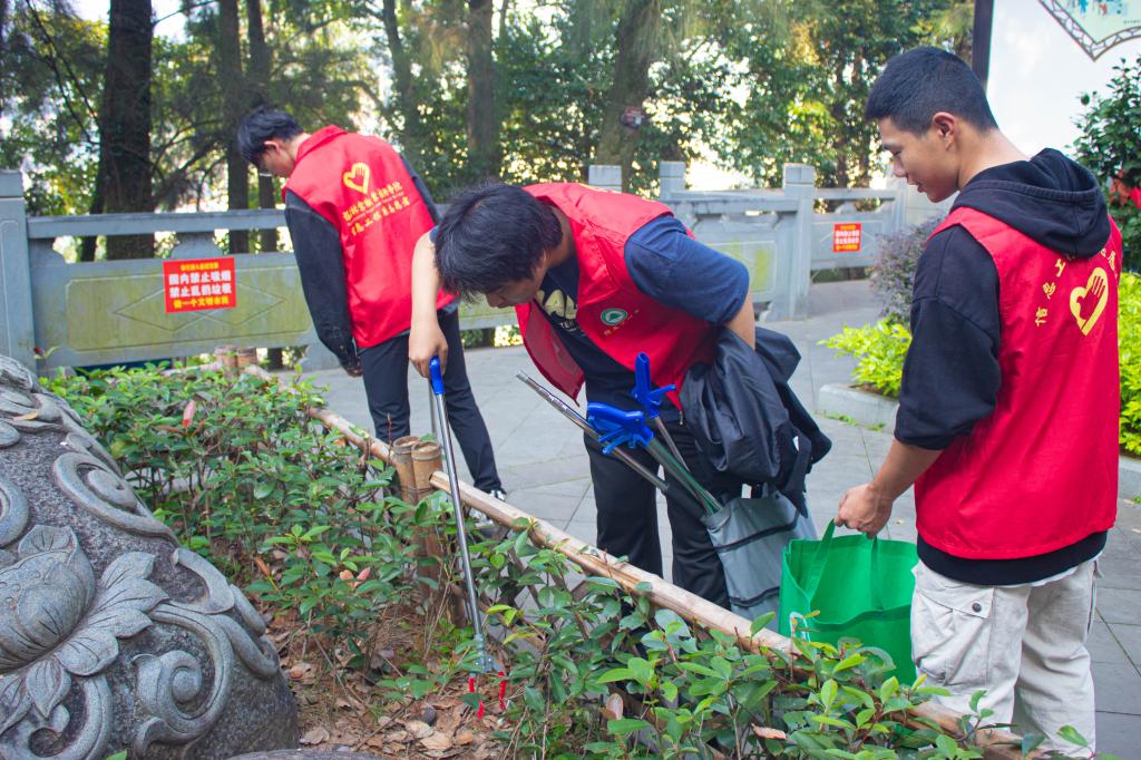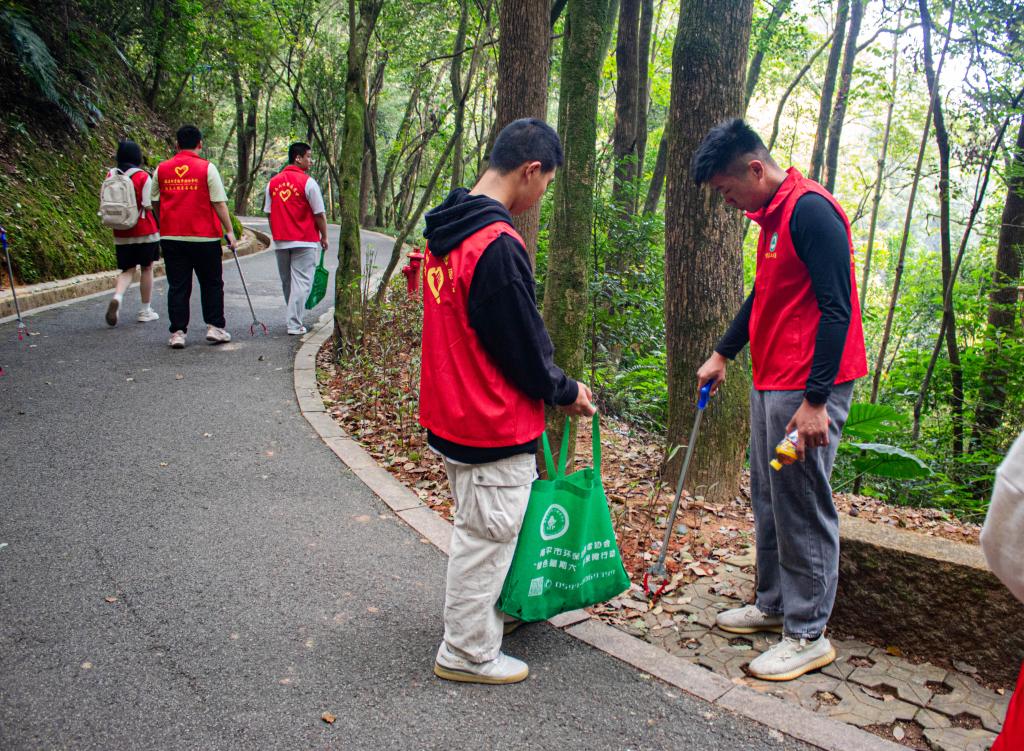 活动伊始,志愿者们干劲十足,有条不紊的进行清洁活动。早上八点,志愿者们在九峰山公园下集合完毕,一人一个垃圾钳和环保袋,对公园进行了地毯式搜索,将地面上的垃圾捡起放进环保袋里。