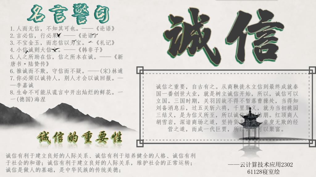 系部组织2023级学生将自己了解的“诚实守信”绘制成一张张精美的电子画报作品,以图文并茂的形式宣传诚信故事,充分体现了同学们知行合一的优良品质。