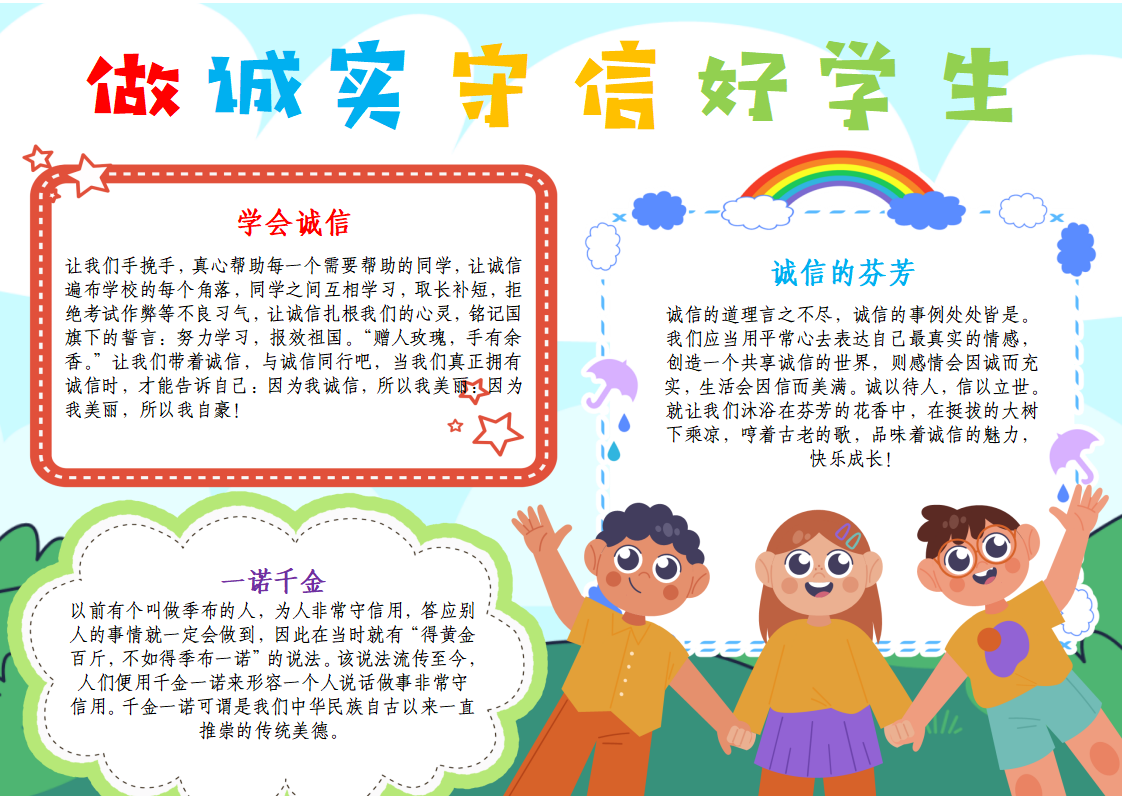 通过主题班会和电子画报制作,增强了同学们的诚信意识,让同学们了解真诚以待、言而有信的重要性,让我们从小事做起,争做新时代诚实守信大学生。