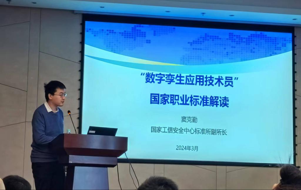 会议中,《中华人民共和国职业分类大典》修订专家委员会委员暨数字职业组组长刘建军专家分享了我国数字职业发展现状和研究成果。随后国家工信安全中心标准所副所长窦克勤从背景和内容对《数字孪生应用技术员》国家职业标准进行解读。