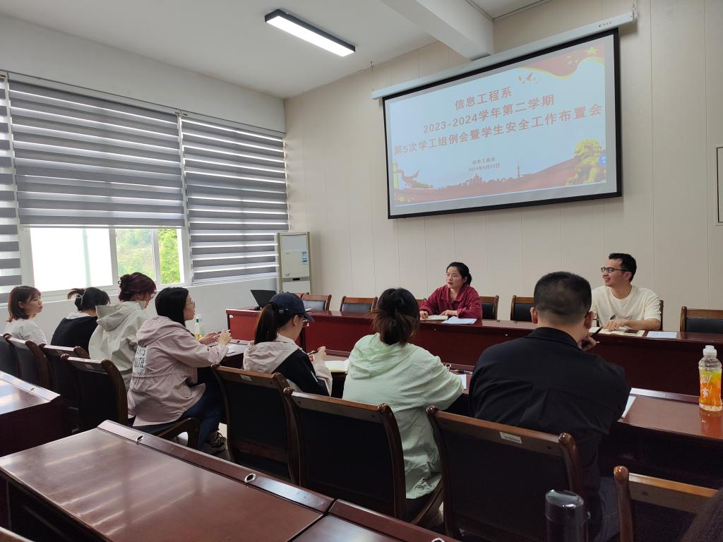 2024年5月13日上午,信息工程系在信工楼408会议室召开学工组例会暨学生安全工作布置会。信息工程系党总支副书记(主持工作)叶文美、专职组织员谢婉欣、学生科科长吴文杰及全体辅导员参加会议。