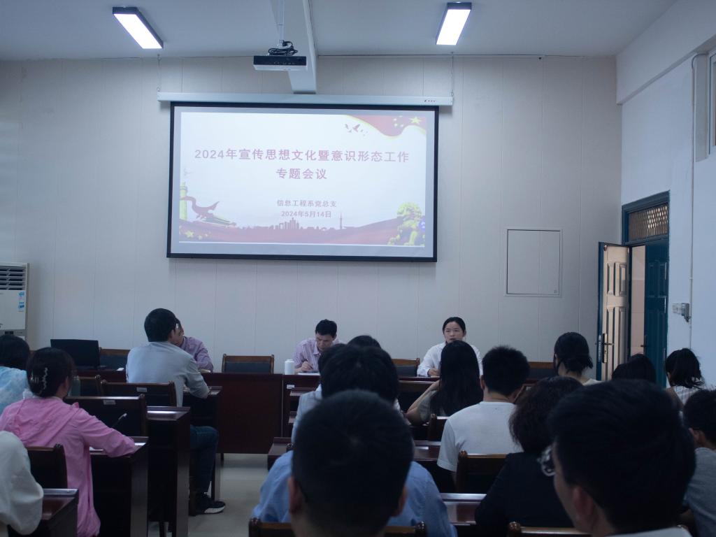 2024年5月14日下午,信息工程系党总支在信工楼408会议室召开2024年宣传思想文化暨意识形态工作专题会议。副院长谢金生出席会议,会议由系党总支副书记(主持工作)叶文美主持,系部全体教职工参加此次会议。