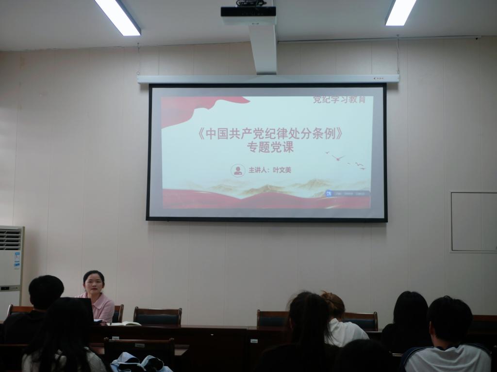 为深入学习贯彻习近平总书记关于党纪学习教育的重要讲话和重要指示精神,进一步增强入党积极分子的党性修养和纪律意识,2024年6月18日下午,信息工程系党总支叶文美老师在信工楼408会议室为57期33名入党积极分子讲授《中国共产党纪律处分条例》专题党课。
