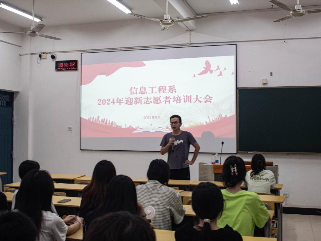 为培养一批热情、专业、有责任感的志愿者队伍,为新同学提供优质的服务,为更好地迎接新生入学,提升志愿者服务水平,2024 年 9 月 5 日晚上19:30,信息工程系在实训四教学楼506教室组织了一场针对新生志愿者的培训会。学生科科长兼团总支书记吴文杰老师、学生会主席谢煌杰以及全体新生志愿者参加会议。此次培训会由学生会主席谢煌杰主席主持。