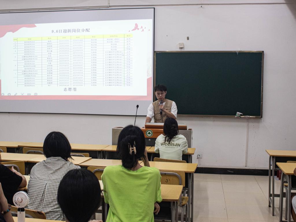 会议伊始,谢煌杰学长将我系大本营的位置图及车流量的路线投至到了大屏幕,并向新生志愿者们介绍了车流量路线的走向及车辆的停放问题。接着他就志愿者的分组、任务进行布置安排,他将志愿者的分组情况发布下去,并详细介绍了每个组别的志愿者的工作任务。