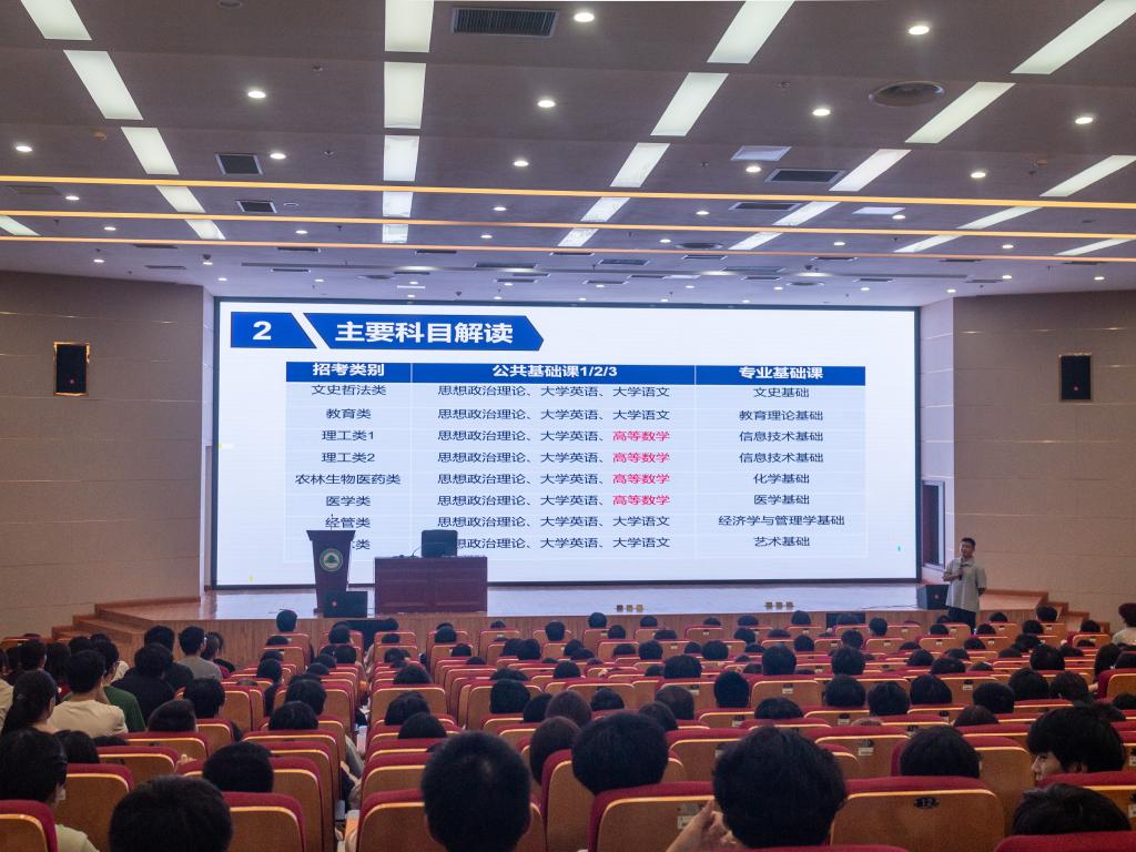 讲座伊始,吴老师精心准备了暖场活动,将氛围暖了起来。紧接着他从考情新解读和主要科目解读两方面进行详细介绍。他提到,近年来专升本的报考人数呈逐年上升趋势,这反映出越来越多的同学意识到学历提升的重要性。同时,竞争也日益激烈,各院校的录取分数线也随着报考人数的增加有所波动。他还介绍了专升本考试的相关概况,包括报名对象、报名时间等;对于不同专业对应的考试科目有所差异,吴老师也都逐一进行了分析讲解,让同学们对自己需要备考的科目有清晰的认识。