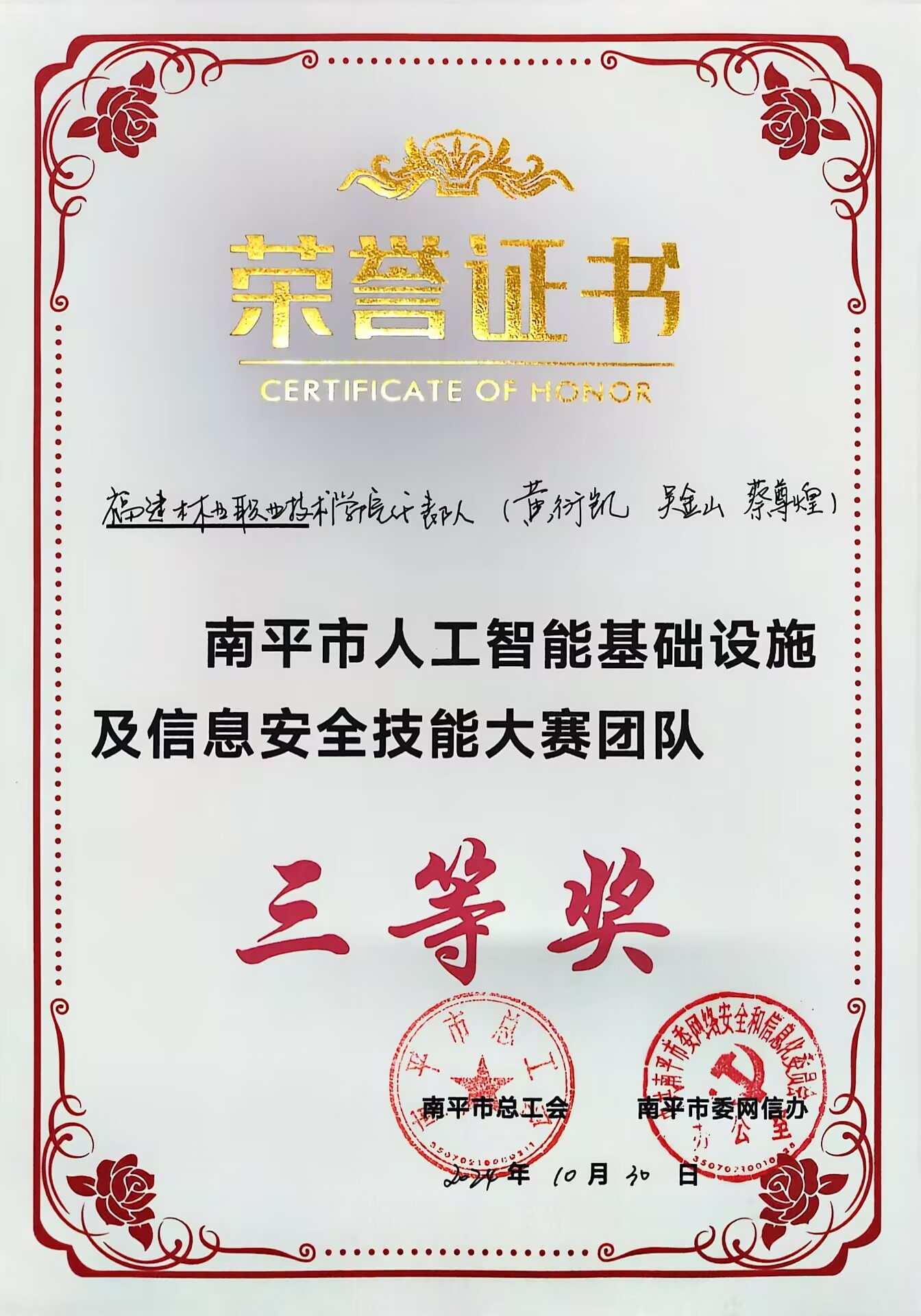 为深入贯彻落实习近平总书记对技能人才工作的重要指示,学习贯彻习近平总书记关于数字中国建设的重要论述,积极响应国家战略需求,扎实开展“工助振兴”专项行动,发展新质生产力,培养和选拔一批高素质数字工匠人才,助力打造闽北数字经济新引擎、推动数字南平高质量发展。10月30日,根据南平市第三届数字工匠技能大赛总体安排,信息工程系派出由蔡尊煌、黄衍凯、吴金山三位老师组成的福建林业职业技术学院代表队到南平市建阳区参加了人工智能基础设施及信息安全职工技能竞赛,经过激烈角逐,最终荣获团队“三等奖”的优异成绩!