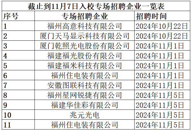 据统计,截止到11月7日,信息工程系共举行11场线下线上校园专场招聘会,先后有福州高意科技有限公司、厦门天马显示科技有限公司、厦门乾照光电股份有限公司、福建福光股份有限公司、福建福米科技有限公司等11家企业入校宣讲招聘,为毕业生和企业单位搭建了良好的沟通双选平台。