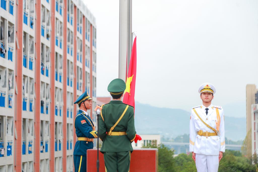 在晨曦的映照下,国旗在微风中飘扬,雄壮而庄严。师生们整齐列队,肃立在操场上,目光投向国旗。旗手手持国旗,迈着整齐有力的步伐走向旗杆。随着旗手的脚步声,肃穆的氛围弥漫整个校园。旗手停在旗杆前,缓缓解开国旗,一面五星红旗在晨风中展开,飘扬起来。国歌的旋律响起,师生们一同行注目礼,目光凝视着高高飘扬的五星红旗,内心充满了对祖国的热爱和敬意。