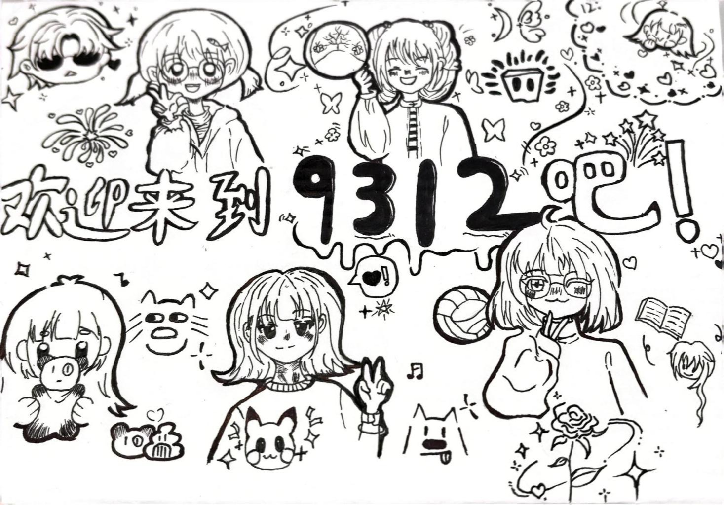 宿舍号:9312设计理念:整个门牌采用手绘风格,将宿舍每个人的形象画出来,表达出一种友好、欢乐的氛围。
