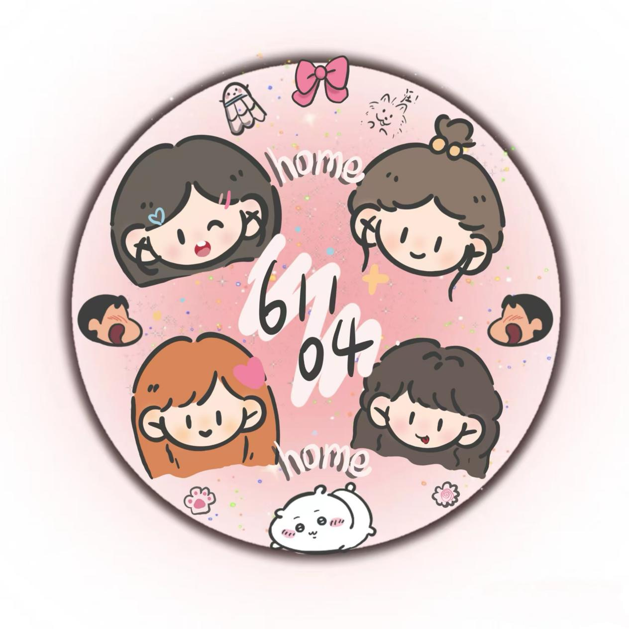 宿舍号:61104设计理念:宿舍logo以粉色为底色,显得温馨可爱。中间有“61104”的数字,代表宿舍房间号。周围有四个女生头像,象征着宿舍的四位成员,传达出室友间亲密和谐的关系。“home”字样出现,强调宿舍就像家一样温暖。其他小装饰如蝴蝶结、小动物等,增添了活泼的氛围,整体设计充满了青春活力和归属感。通过可爱的元素和温馨的色调,展现宿舍成员间的亲密关系,传递出宿舍是温暖的家的理念。