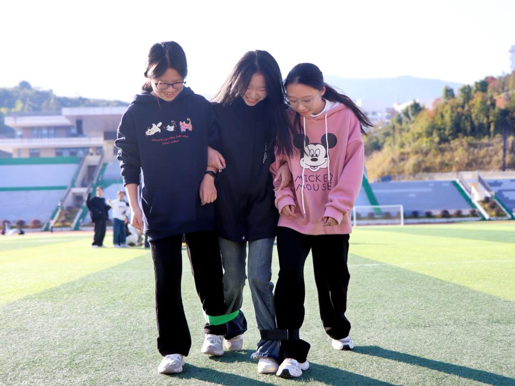 随着裁判的一声哨响,三人四足的比赛率先拉开了帷幕。参赛队员们将相邻两人的内侧小腿紧紧绑在一起,像一列小火车般并排向前冲刺。他们喊着整齐的口号,步伐一致地冲向终点,现场观众纷纷为他们加油助威。紧接着是指压板跳绳比赛,每队6名队员依次在指压板上跳绳,忍受着脚下的疼痛,坚持完成每一次跳跃,展现出了坚韧不拔的精神。