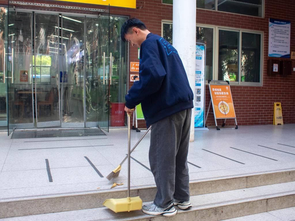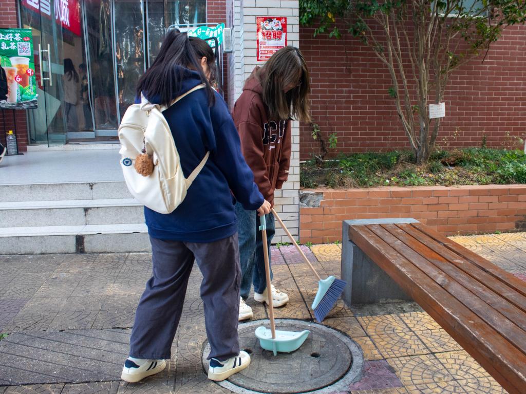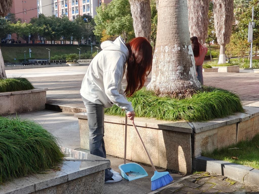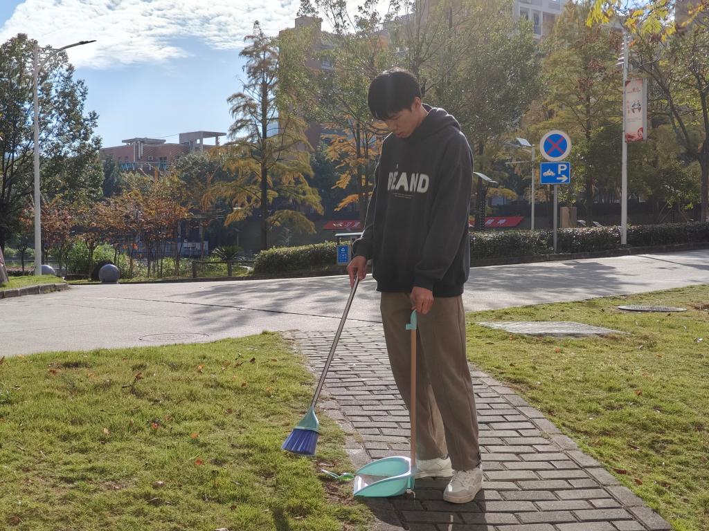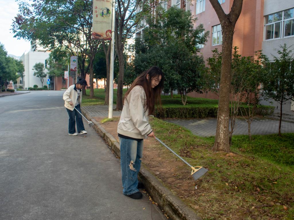 在食堂侧门区域,一组同学默契配合、协同发力,针对餐后遗留的各类垃圾开展“攻坚行动”。只见其中一名同学稳稳握住大扫帚,凭借娴熟利落的动作,大力挥动扫帚,所到之处,纸巾、竹签、食品包装袋等垃圾如同听到指令的“士兵”,迅速被聚拢一处,扫帚与地面摩挲,发出节奏明快的“唰唰”声响,奏响劳动乐章。与此同时,另一位同学半蹲在地,全神贯注,手提簸箕严阵以待,精准承接扫来的垃圾,并不时用手细致拨弄,确保毫无遗漏,点滴细节尽显严谨细致作风。