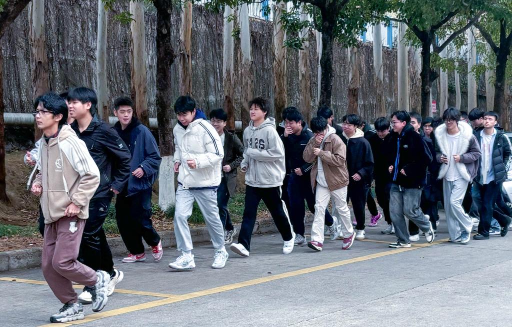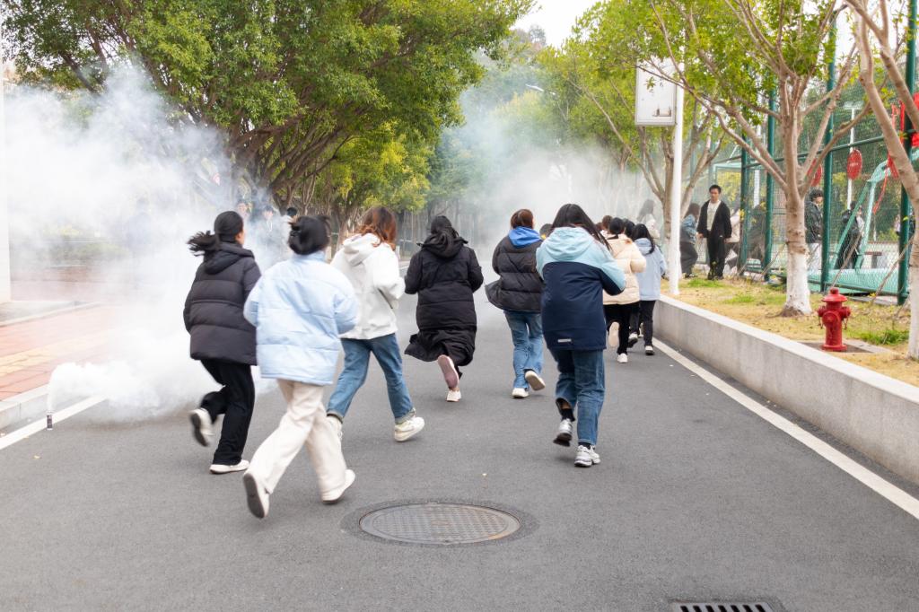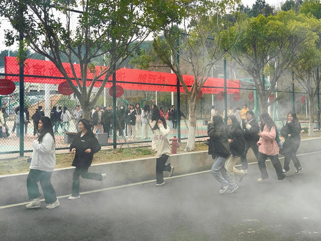 随着警报声的响起,消防演练正式开始。信工楼内瞬间弥漫着模拟的烟雾,顿时气氛变得紧张,同学们弯着腰,捂着口鼻,在老师和工作人员的引导下,按照事先规划的逃生路线,迅速而有序地撤离到安全区域。整个过程中,同学们保持了高度的警觉和冷静,展现出了良好的应急反应能力。