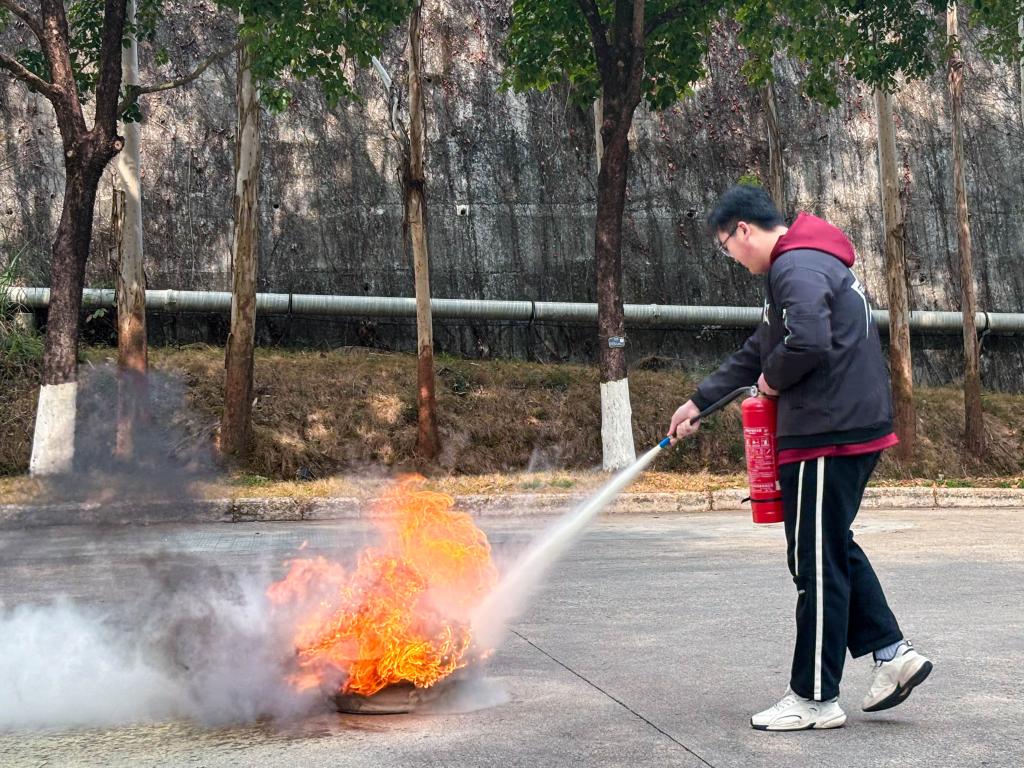 随后,在消防员的指导下,各班的保卫委员体验了灭火器的使用方法,学习了如何快速有效地扑灭初期火灾。通过实操,提高对灭火器的操作熟练度,对火灾扑救有了更直观的认识。