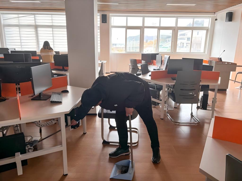 在活动当天,同学们带着清洁工具准时到达信工楼,在负责人的安排下,大家分工合作,井然有序地开始了清洁工作。有的同学仔细擦拭电脑屏幕和键盘,不放过任何一个角落,确保设备干净无尘;有的同学拿着扫帚和簸箕,认真清扫地面,将角落里的垃圾清理得干干净净;还有的同学整理杂乱的桌椅和线路,让电脑房变得整洁有序。虽然任务繁重,但同学们干劲十足,不怕脏、不怕累,认真细致地清洁着每一个角落。经过一个多小时的辛勤劳动,机房教室焕然一新,展现了新时代大学生团结协作的精神风貌,为师生们营造了一个更加舒适、整洁的学习环境。