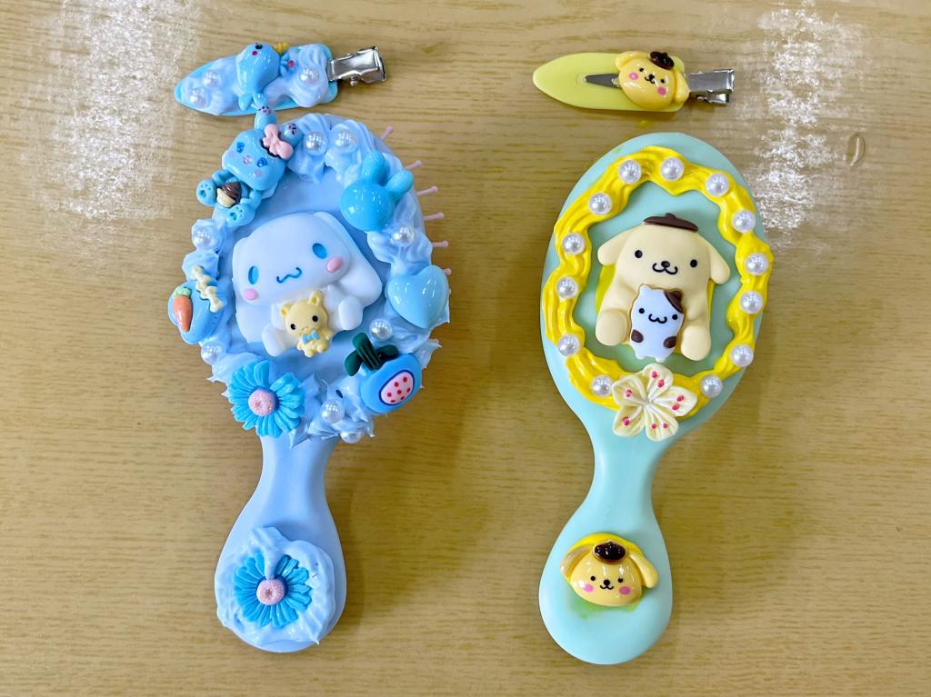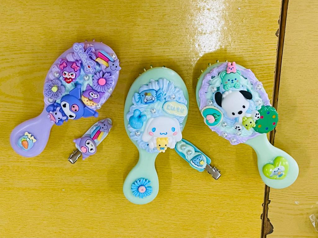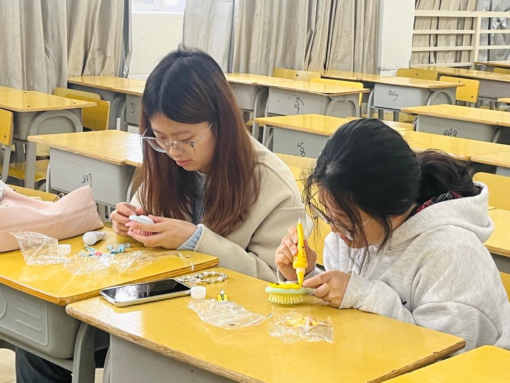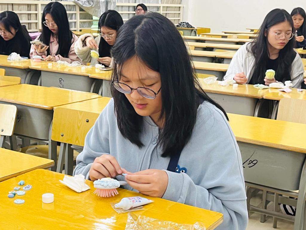 制作环节正式开始,女生们迅速沉浸到创意世界中。瞧,有的女生手持裱花嘴,小心翼翼地挤压奶油胶,在梳子柄上勾勒出可爱的图案,眼神专注而认真,仿佛在雕琢一件稀世珍宝;旁边几位女生组成姐妹团,一边热烈讨论设计方案,一边相互帮忙传递材料,你一言我一语,不一会儿,梳子上便出现了梦幻的彩虹、俏皮的卡通形象。