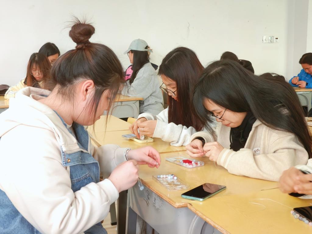 活动当天,女生们早早来到现场,在签到台前排起了整齐的队伍,脸上洋溢着期待的笑容。她们有序签到后,兴奋地领取手工材料包。材料包里,色彩缤纷的奶油胶、造型各异的梳子、琳琅满目的串珠和精致的手链配件,瞬间点燃了大家的创作热情。