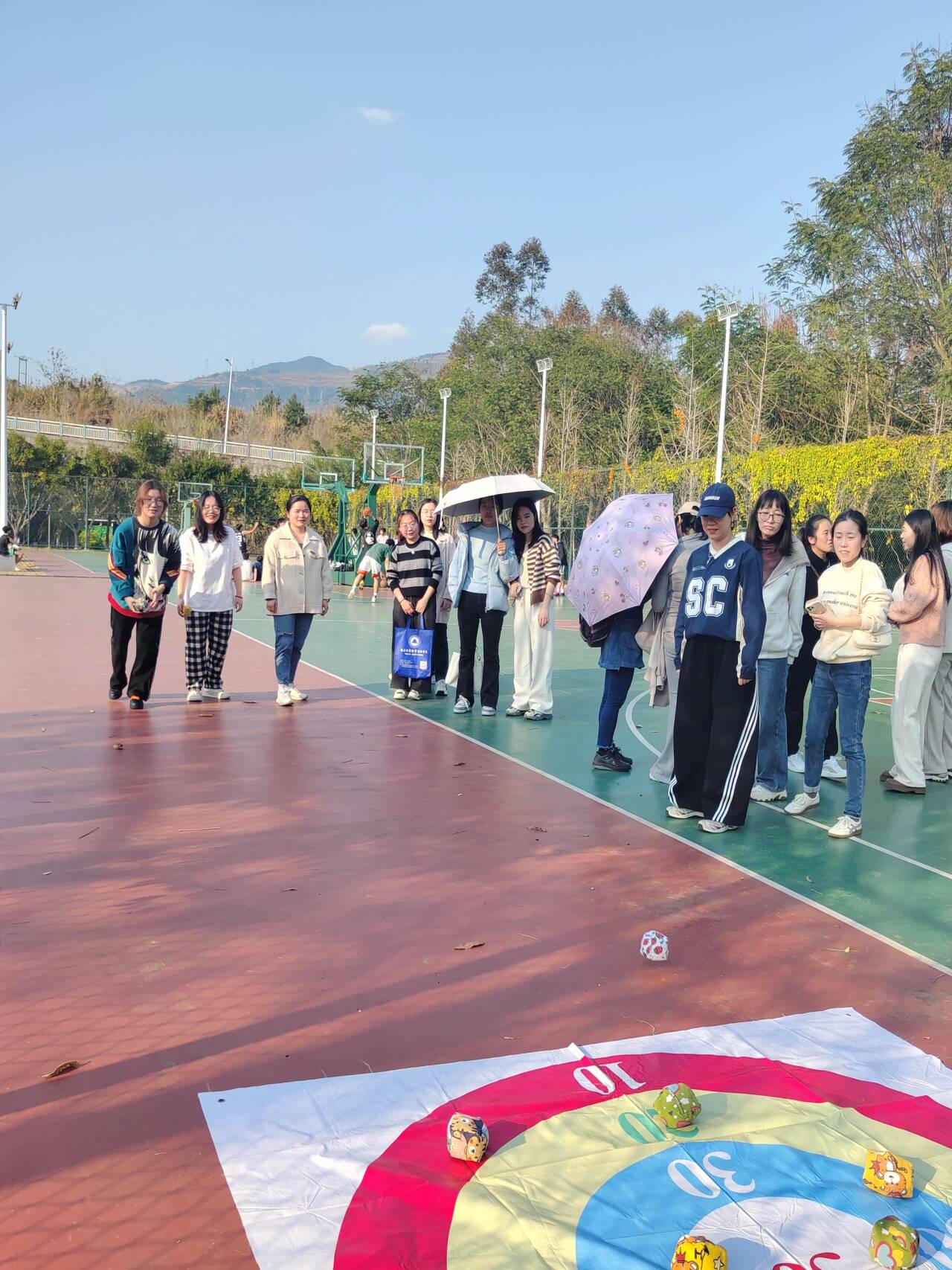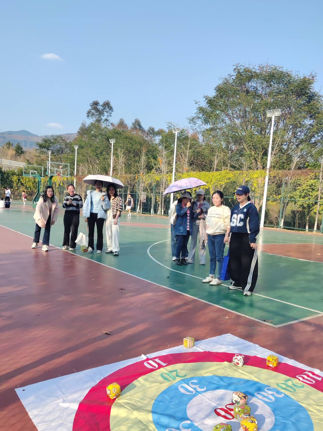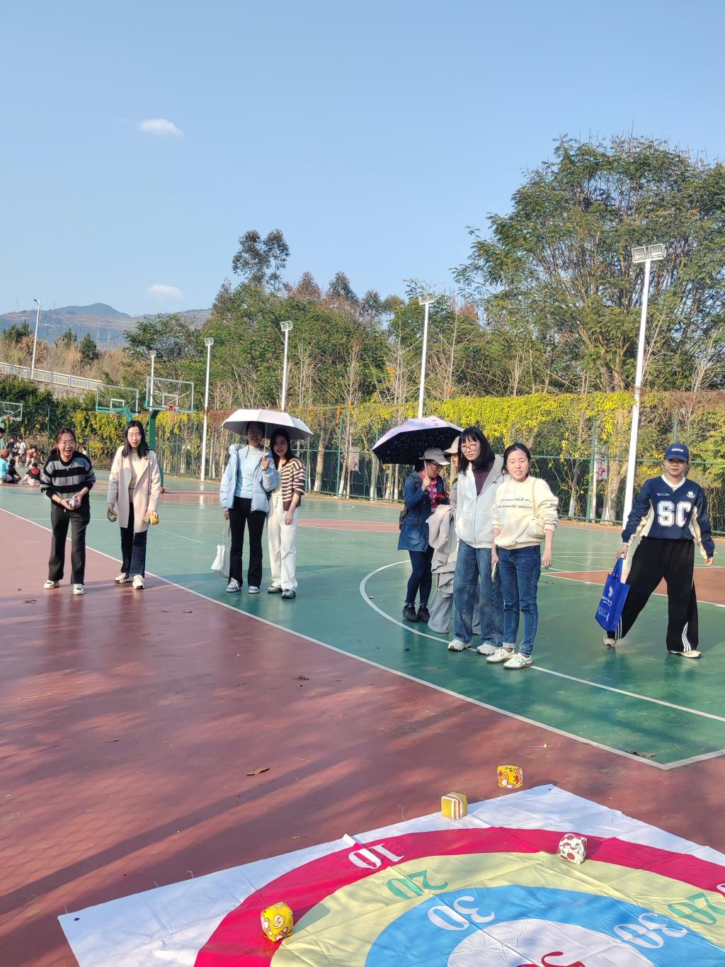 在扔沙包赛项中,女教职工们有序排队,保持安全距离进行投掷。大家本着“友谊第一、比赛第二”的原则,欢乐竞技。