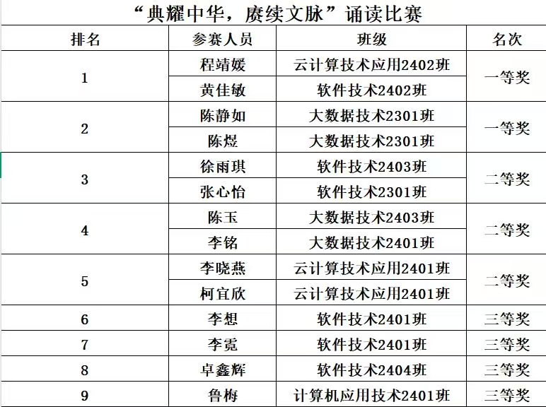 为传承中华优秀传统文化,弘扬民族精神,提升学生文化素养,信息工程系于3月11日下午3时在江南礼堂隆重举办“典耀中华,赓续文脉”经典诵读比赛。系部高度重视此次比赛,积极组织筹备,力求为学生打造一个展示自我、传承文化、提升素养的优质平台。
