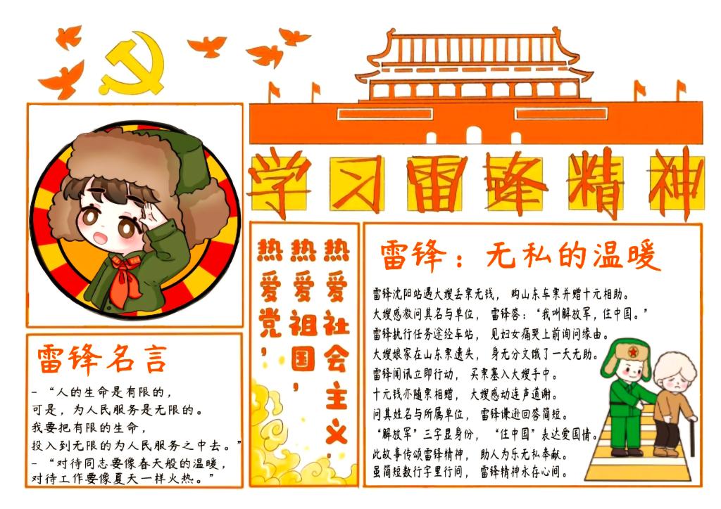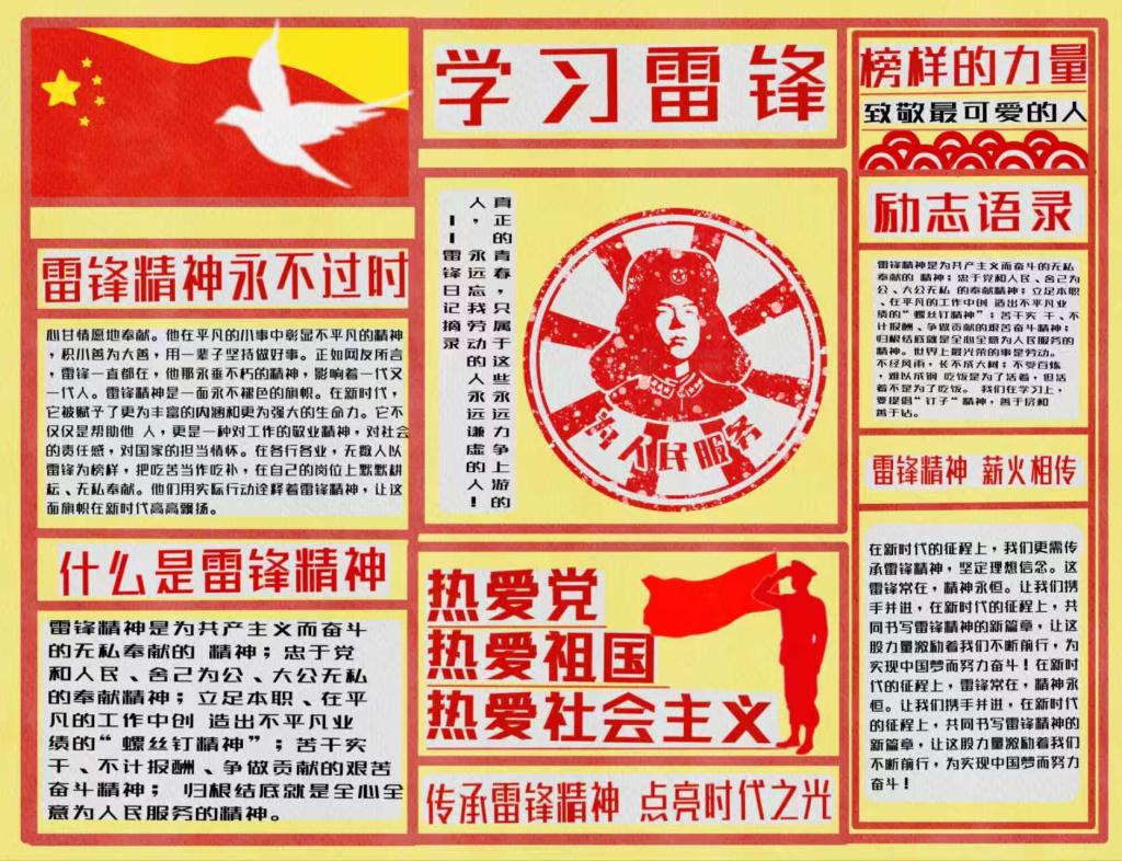 随后,各班级开展了形式多样的讨论与分享活动。同学们纷纷结合自身经历,畅谈对雷锋精神的理解和感悟。有的同学表示,雷锋精神是一种无私奉献的大爱,是在日常生活中对他人点滴关怀;有的同学则认为,在当今社会,雷锋精神更显珍贵,它是构建和谐社会的强大精神动力。同学们一致认为,应该将雷锋精神内化于心、外化于行。有的班级还以宿舍为单位,举行了“学雷锋,树新风”主题手抄报比赛,同学们纷纷踊跃创作,勾勒出自己对雷锋精神的感悟。