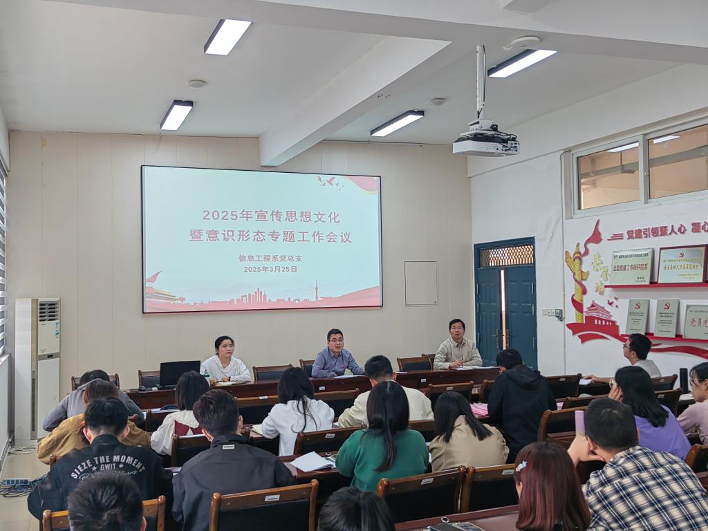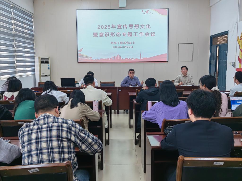 2025年3月25日下午,信息工程系党总支在信工楼408会议室召开2025年宣传思想文化暨意识形态专题工作会议。系部全体教职工参加了会议,会议由系党总支书记、主任华建祥主持。