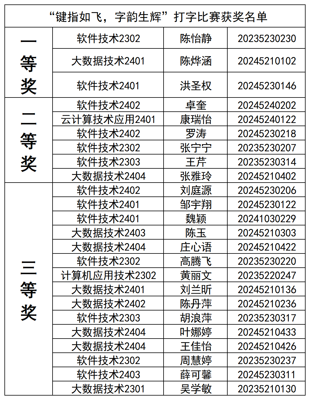 经过激烈角逐,比赛决出一等奖 3 名、二等奖 5 名、三等奖 15 名。获奖选手在速度与精度间展现出卓越平衡。现场观赛同学纷纷表示:"这样的活动既有趣又实用,让我们意识到打字技能对专业学习的重要性。"本次比赛获奖名单如下: