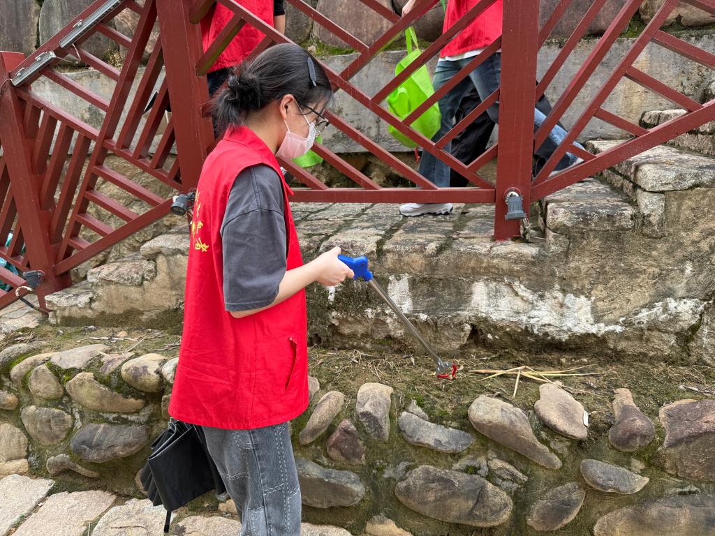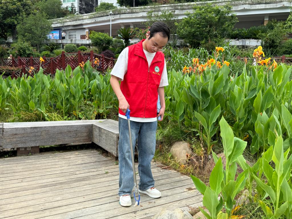 志愿者们两两协作,或俯身用夹子精准夹取细碎烟头,或弯腰探入灌木丛深处清理包装袋,不放过任何一个卫生死角。有的志愿者蹲在步道旁,专注地用工具夹出卡在缝隙中的塑料碎片,其他志愿者则紧跟其后,将分类后的垃圾装入环保袋。