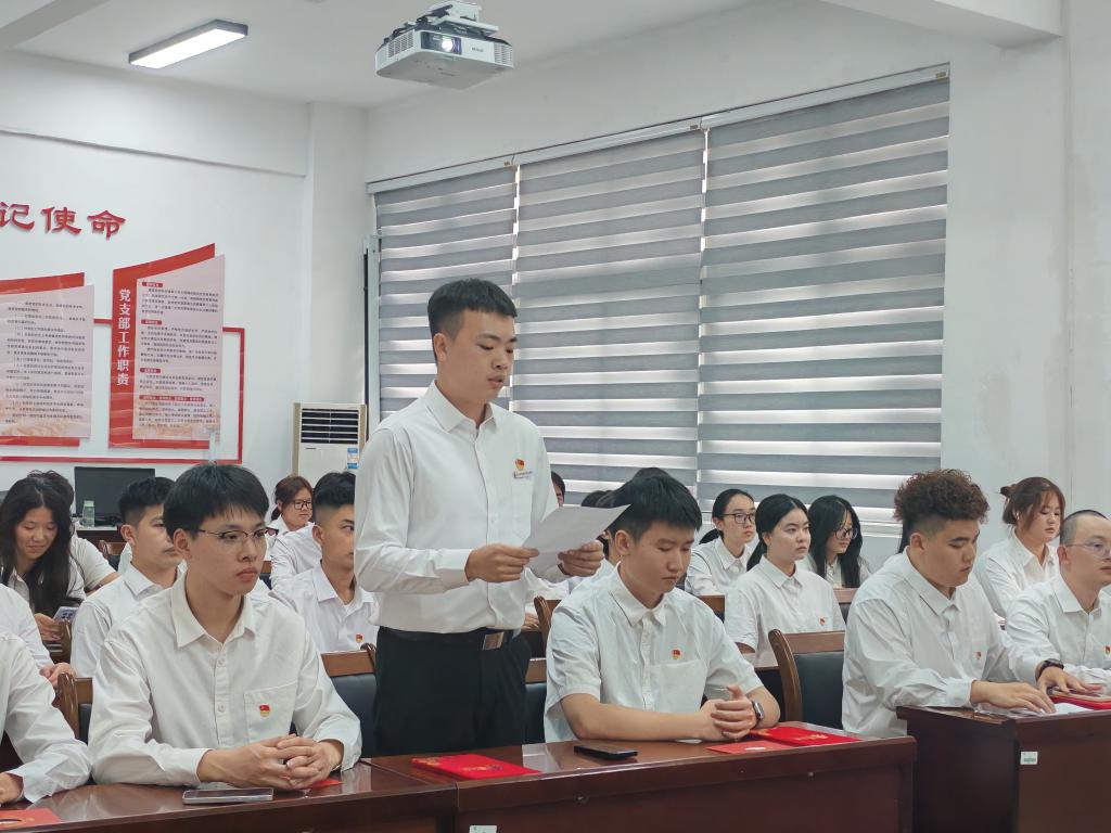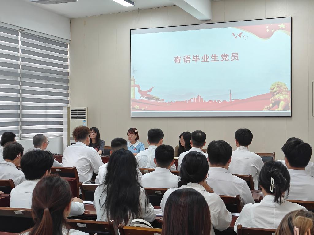 活动最后,学生第一党支部书记郑燕丽、学生第二党支部书记陈雅佳共同寄语毕业生党员。他们提出三点希望:一是常怀感恩之心,将个人理想融入党和国家事业;二是永葆奋进之志,在基层一线锤炼本领;三是绷紧纪律之弦,以清正廉洁赢得人生长跑。全体党员面向党旗重温入党誓词,铿锵誓言回荡在会场,更铭刻在每位毕业生党员心中。