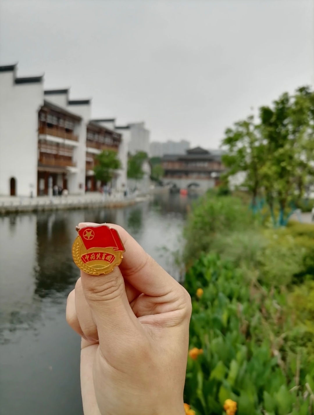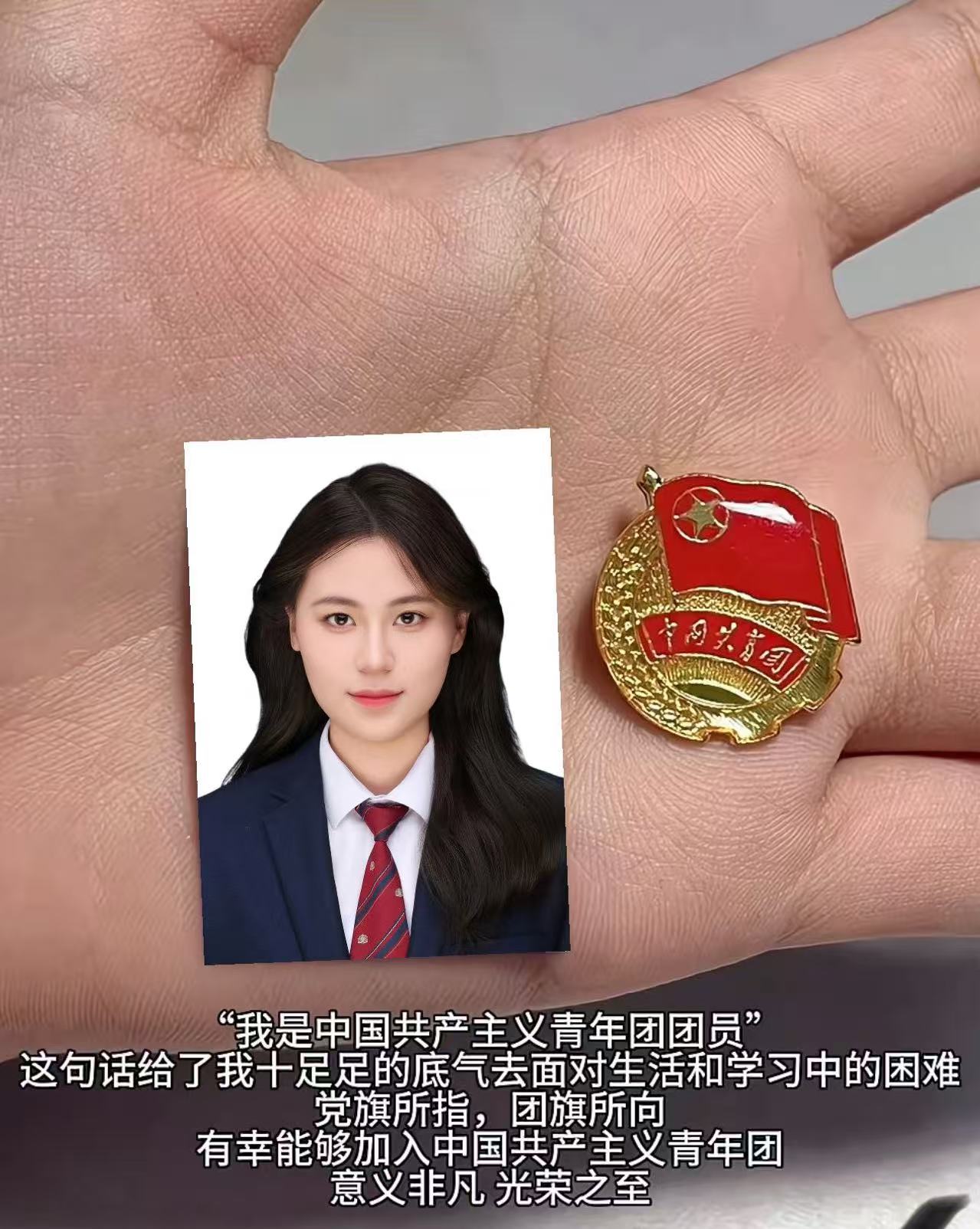在这张照片里,我与熠熠生辉的团徽同框。团徽,是中国共青团的标志性符号,红旗、五角星、齿轮麦穗,组合成庄严而神圣的形象,承载着共青团的光辉历史与使命。与团徽合影,于我而言意义非凡。它象征着我对共青团精神的敬仰与追随,激励我牢记初心,在新时代浪潮中,以奋斗为笔,以担当为墨,书写属于青年的华章,让青春在奉献中绽放光彩。