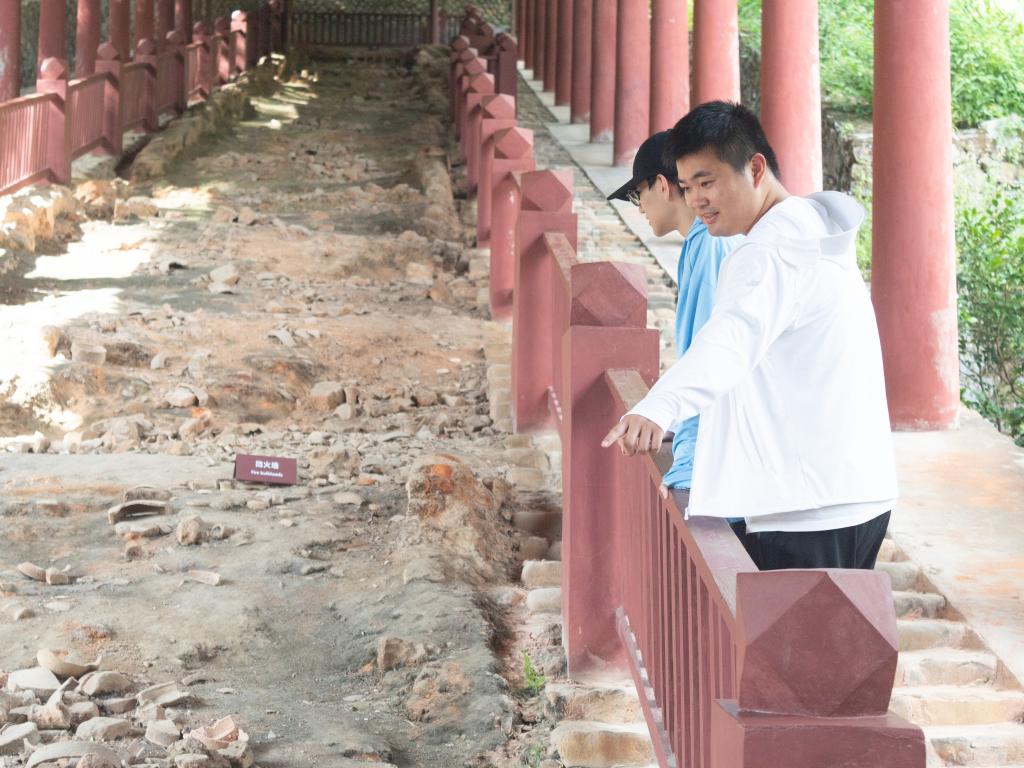 在遗址公园内,队员们沿木质栈道缓缓前行,仔细观察古窑残存的结构与烧制痕迹。“古窑采用‘龙窑’形制,依山而建,利用自然坡度形成温度梯度,一次可烧制上万件瓷器。”古人因地制宜的智慧与精益求精的匠心,让队员们由衷惊叹。