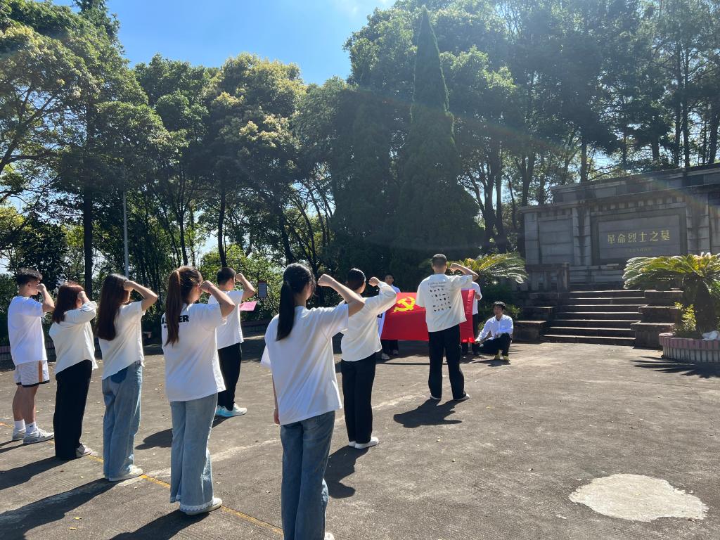 “我志愿加入中国共产党,拥护党的纲领……”纪念碑下,党员队员面向鲜红党旗庄严宣誓,铿锵誓言回荡在陵园上空,既是对入党初心的回望,更是对时代使命的承诺。带队教师吴建森表示:“重温入党誓词,是让青年学子从先烈精神中汲取奋进力量的重要方式。作为新时代青年,更要将个人理想融入国家发展大局,让红色基因代代相传。”