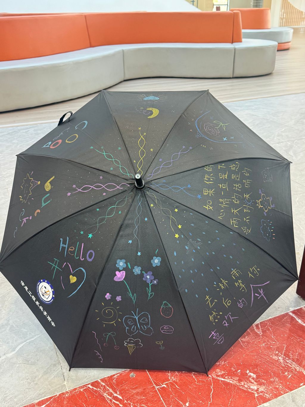 此次活动为同学们撑起了一片释放情绪、传递关爱的天空。一把把原本素白的共享伞摊开在长桌,像等待被点亮的晴空,大家把考试、社团、实习的焦躁统统研磨进颜料,再一笔笔涂成温柔的云、跳跃的霓虹、悄悄话般的卡通。每一笔都是给陌生人的一份暗号式关怀。雨后,这些带着体温与故事的共享伞回到桩位,等待下一位借伞人“啪”地撑开,把午后的阳光、笑声与未曾谋面的关照,一并举过头顶,让整片校园在雨幕里亮起一盏盏彩色的灯。
