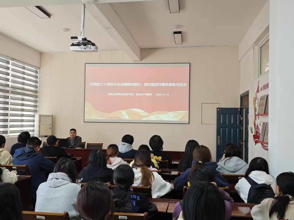 2025年11月14日,信息工程系党总支书记、主任华建祥,在信工楼408为计算机应用技术2401班的全体学生上了一堂生动的党课。本次党课以“以党的二十届四中全会精神为指引,履行新时代青年使命与担当”为主题,旨在引导学生深入学习贯彻党的二十届四中全会精神,明确青年学子新时代使命、强化责任担当,为未来成长和发展奠定坚实基础。