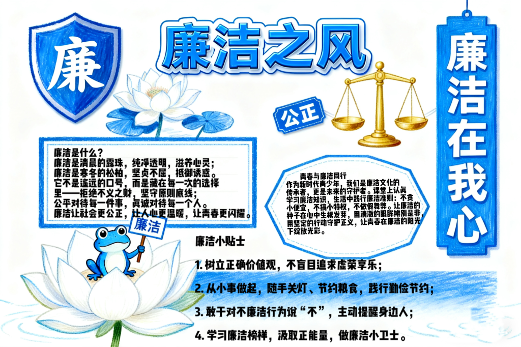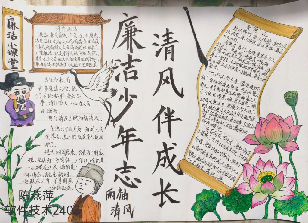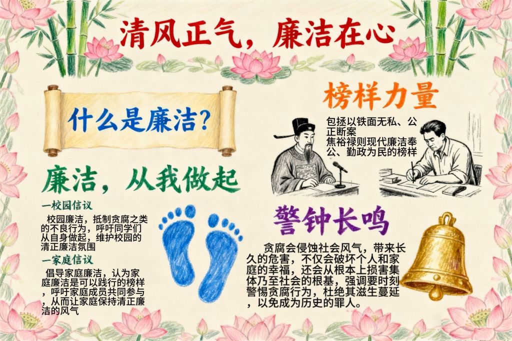 课后,同学们用手抄报诠释对廉洁的理解与坚守,一张张作品中,有对廉洁内涵的阐释,有对榜样力量的敬仰,更有从我做起践行廉洁的坚定决心。以下为部分同学的优秀手抄报作品展示: