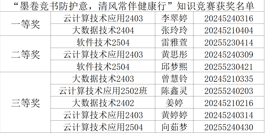 为激发同学们的参与热情,鼓励主动学习安全健康知识,本次竞赛特别设置了丰富的奖励机制,对表现优异的个人予以表彰。以下是本次的获奖名单: