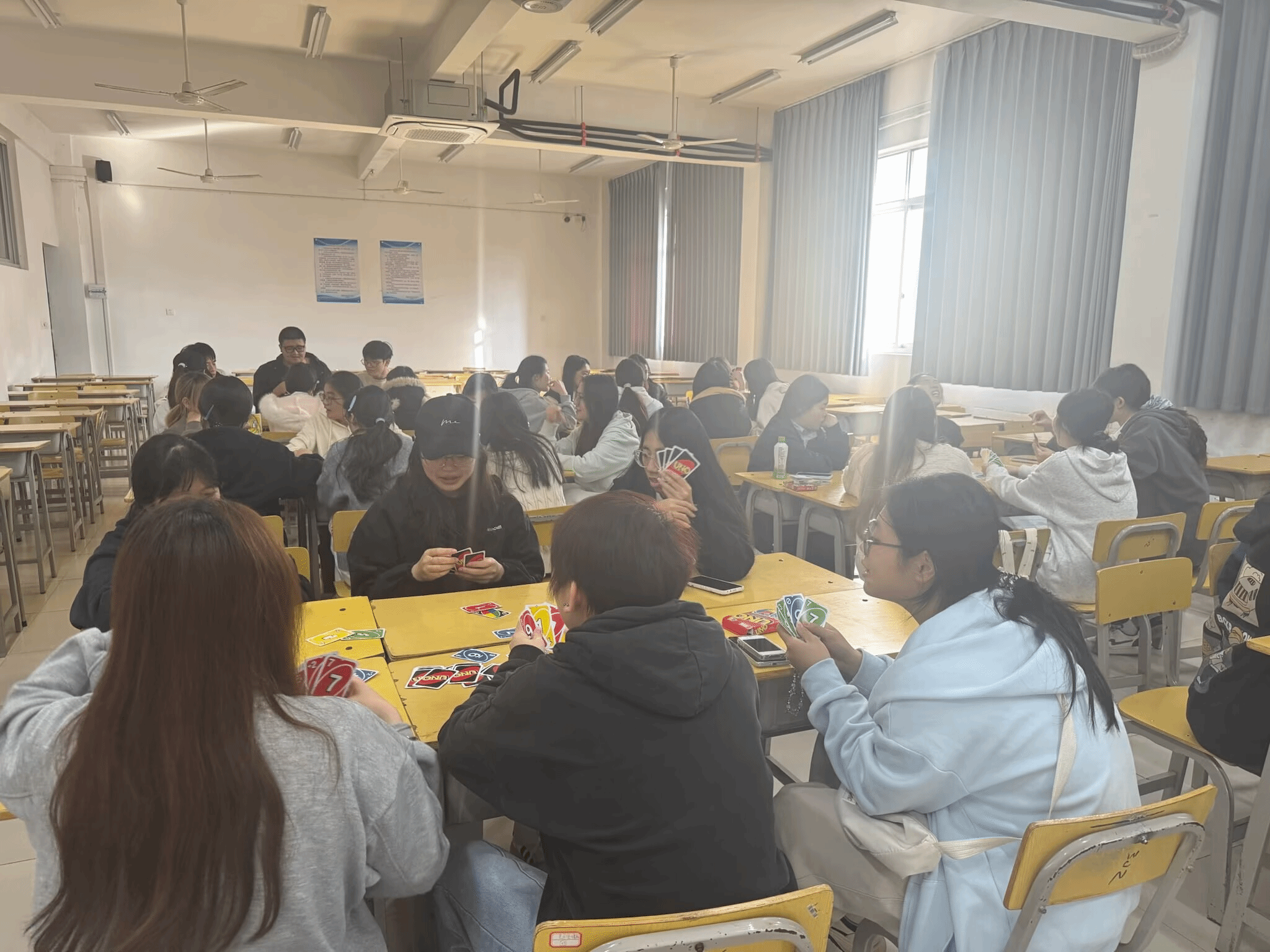 为丰富我系学生的课余文化生活,有效缓解学习压力与生活烦恼,增进同学之间的交流与情谊,12月9日下午,由信息工程系易班工作站主办的“‘信’趣桌游会,欢乐齐加倍”主题UNO桌游活动,在教学楼505教室热闹举行。活动吸引了众多学生踊跃参与,现场气氛轻松活跃,欢声笑语不断。