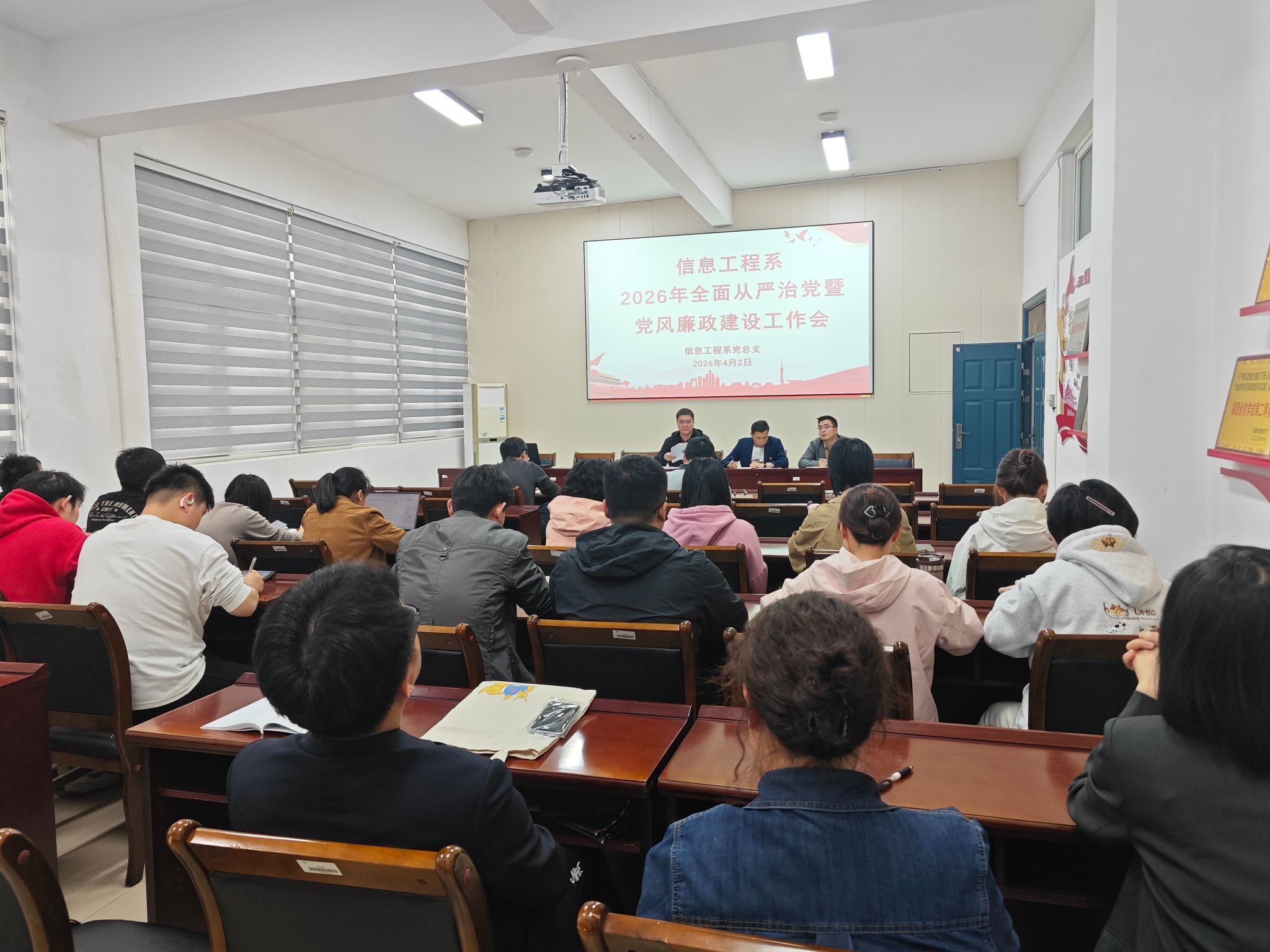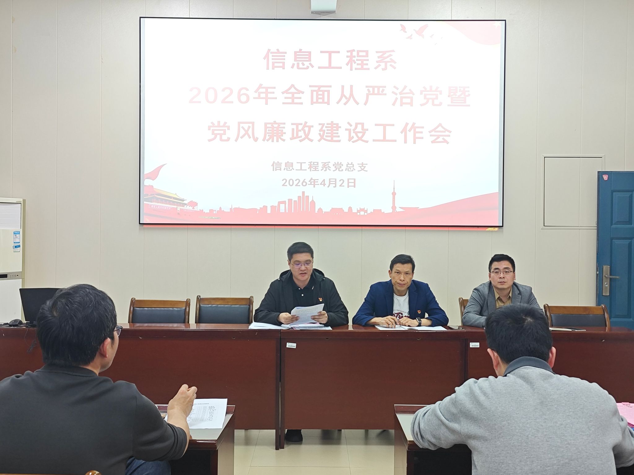 为深入贯彻上级关于全面从严治党的部署要求,压紧压实党风廉政建设责任,4月2日,信息工程系2026年全面从严治党暨党风廉政建设工作会在信工楼408会议室召开。院纪委书记詹其仙、系主任华建祥、党总支副书记(主持工作)王昉出席会议,全系教职工参会,会议由王昉同志主持。